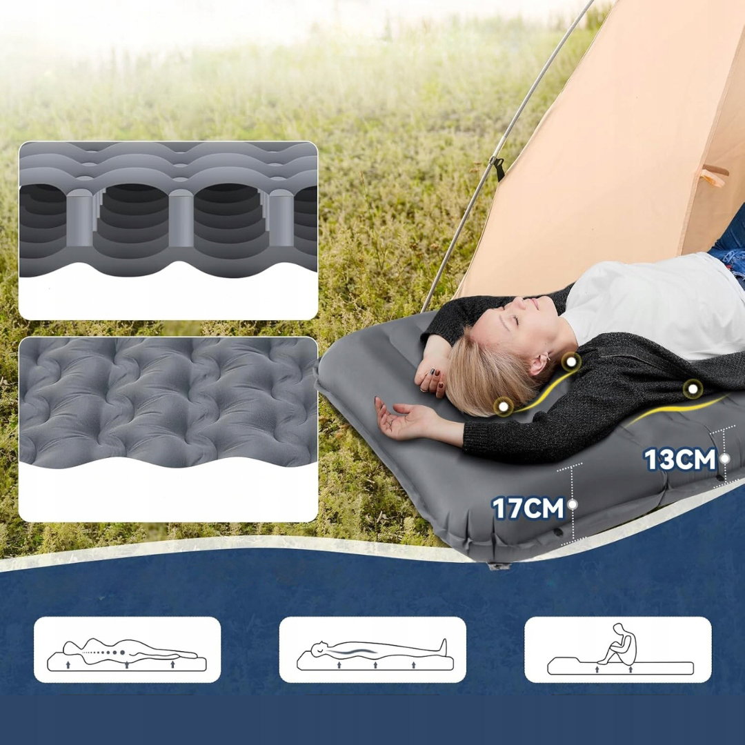 - Maksymalne wsparcie i komfort snu: innowacyjna falista struktura powierzchni oraz wewnętrzna konstrukcja wspierająca zapewniają optymalne podparcie kręgosłupa nawet przy maksymalnym obciążeniu 300 kg. Mata o grubości 13 cm skutecznie izoluje od zimnego podłoża i twardych kamieni, a ergonomiczna strefa poduszki o wysokości 17 cm gwarantuje dodatkowy komfort i spokojny sen.