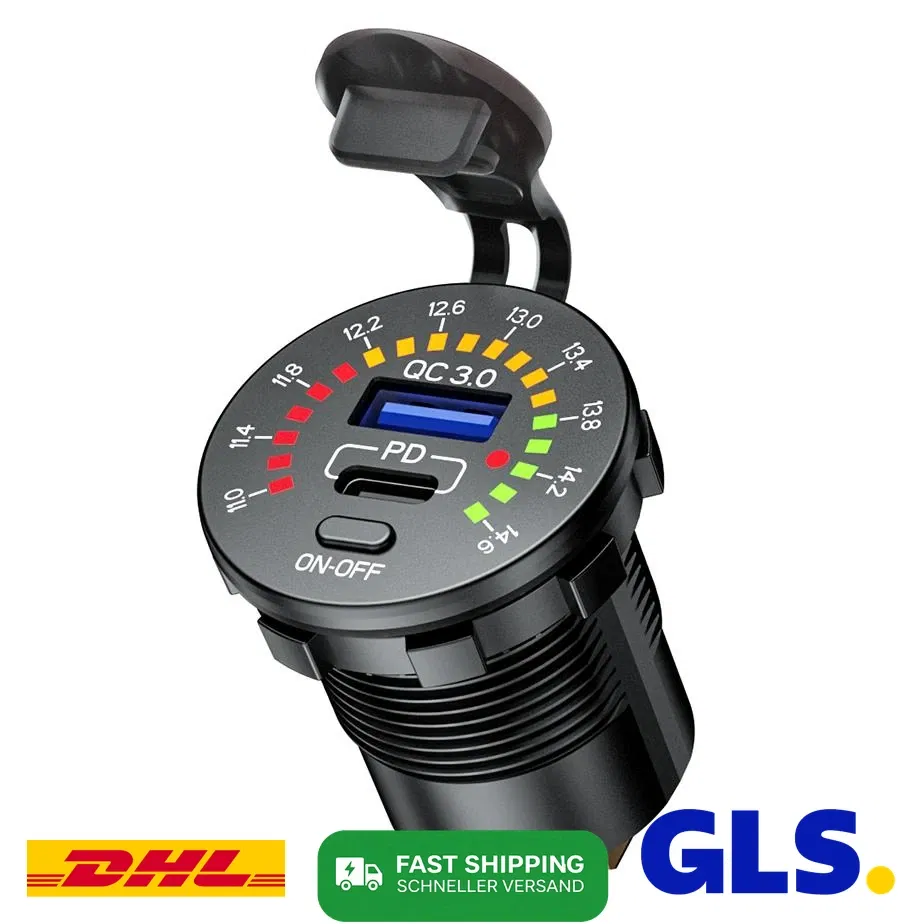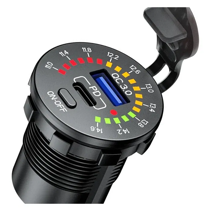 Nazwa handlowa: BIKETEC MOTOCYKLOWE PODWÓJNE GNIAZDO USB Typ-C + USB QC 3.0 - 40 W POWER DELIVERY Z WOLTOMIERZEM MONTAŻ NA POWIERZCHNIE PŁASKĄ (OWIEWKA, KUFER) LUB NA KIEROWNICE - POTRZEBNY ADAPTER BTMUS28 kod ean: 5901445631307 kod producenta: OK48-BTMUS45