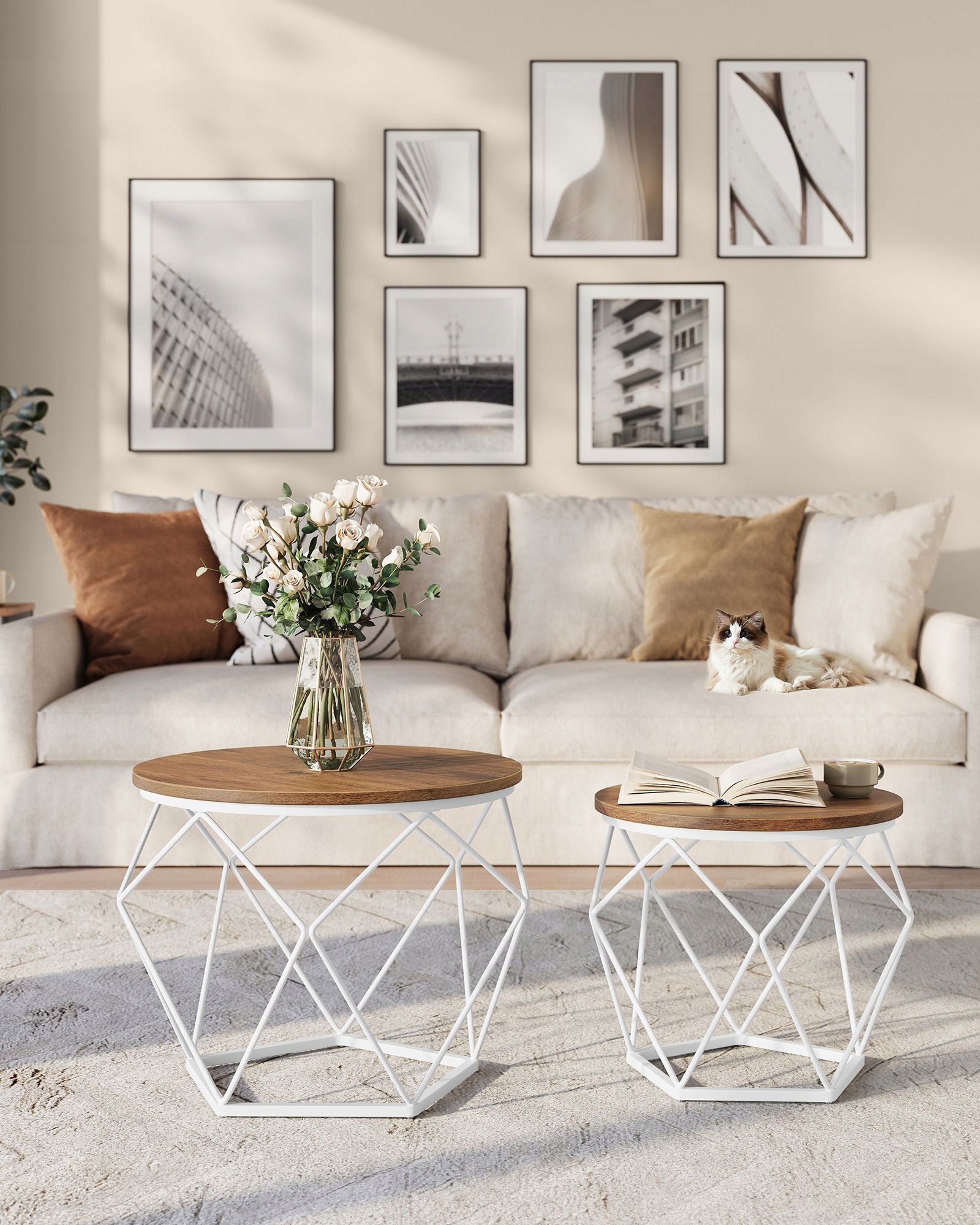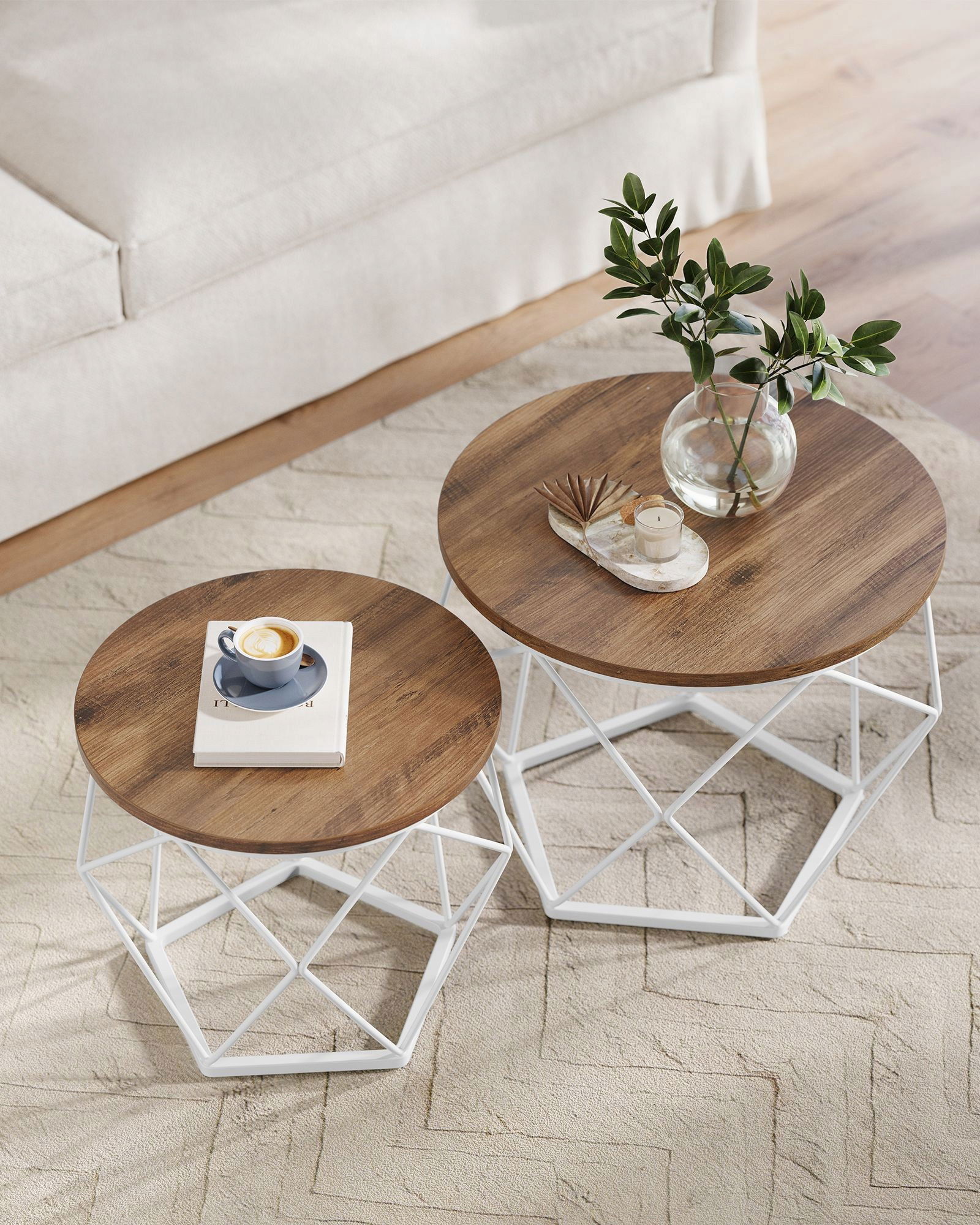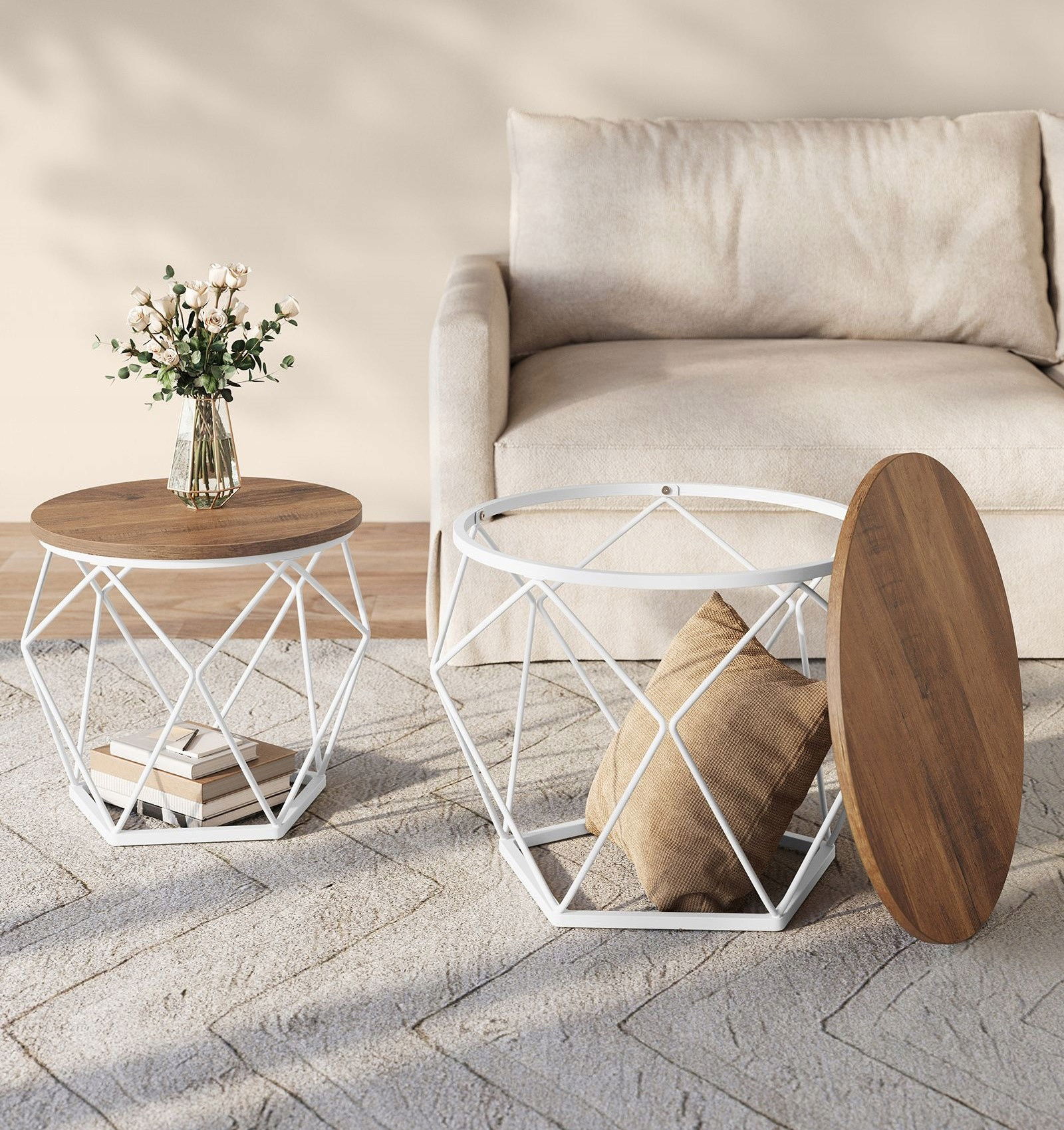 Uroczy komplet dwóch stolików kawowych w dwóch różnych rozmiarach ze stalową białą ramą i zdejmowanym blatem z płyty MDF w miodowo brązowej kolorystyce idealny do salonu, pokoju gościnnego, gabinetu