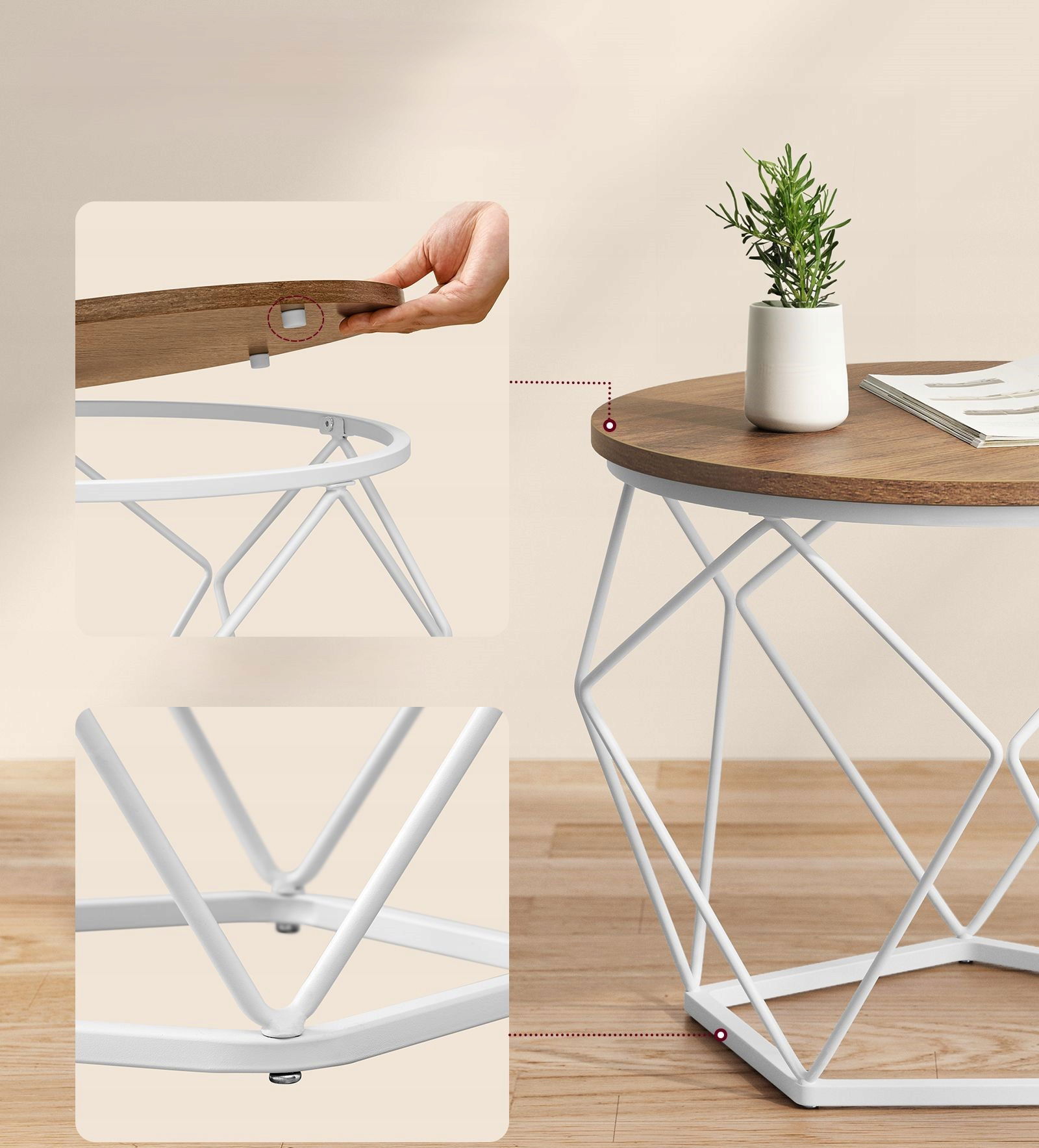 Okrągłe stoliki są idealnym wyborem dla entuzjastów nowoczesnego designu i praktyczności, które doskonale komponują się z wystrojem salonu, dodając mu szczyptę elegancji i stylu. Łatwo zdejmowane blaty z płyty MDF ułatwią czyszczenie i dostosowanie do własnych potrzeb, umożliwiając przechowywanie przedmiotów w ich wnętrzu, takich jak książki czy dekoracje. Można wykorzystać zestaw stolików jako całość, tworząc spójną aranżację w salonie, lub używać ich osobno - jeden obok sofy, a drugi w sypialni. Solidna stalowa konstrukcja zapewnia stabilność i wytrzymałość przez wiele lat, a ich kompaktowe wymiary oraz unikalny design sprawią, że będą one nowoczesnym dodatkiem do każdego pomieszczenia, pozostając jednocześnie funkcjonalnym rozwiązaniem.