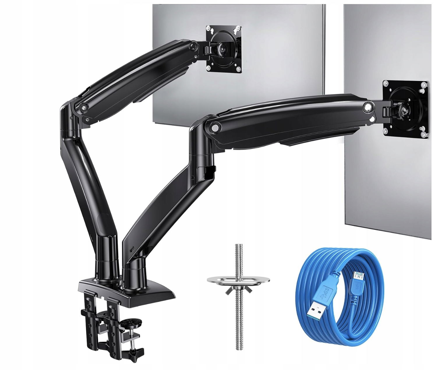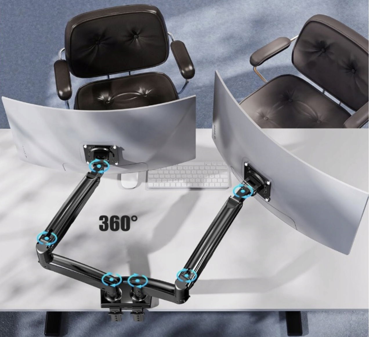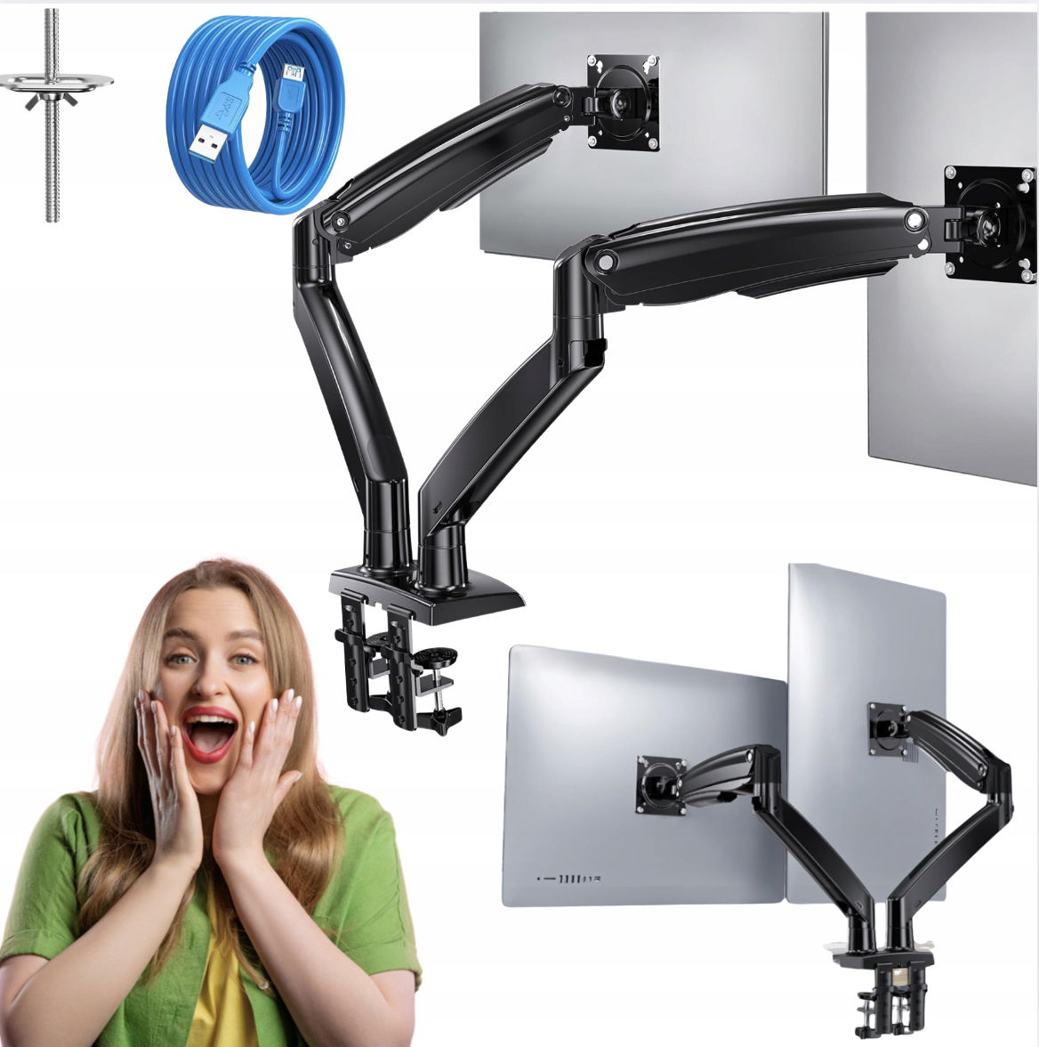 Uchwyt na monitor 2 monitory jest wyposażony w wzmocnioną, opływową ramę ze stopu odlewanego ciśnieniowo i okucia obrotowe z pierścieniem stalowym, aby zapewnić niezawodne pozycjonowanie i stabilność.