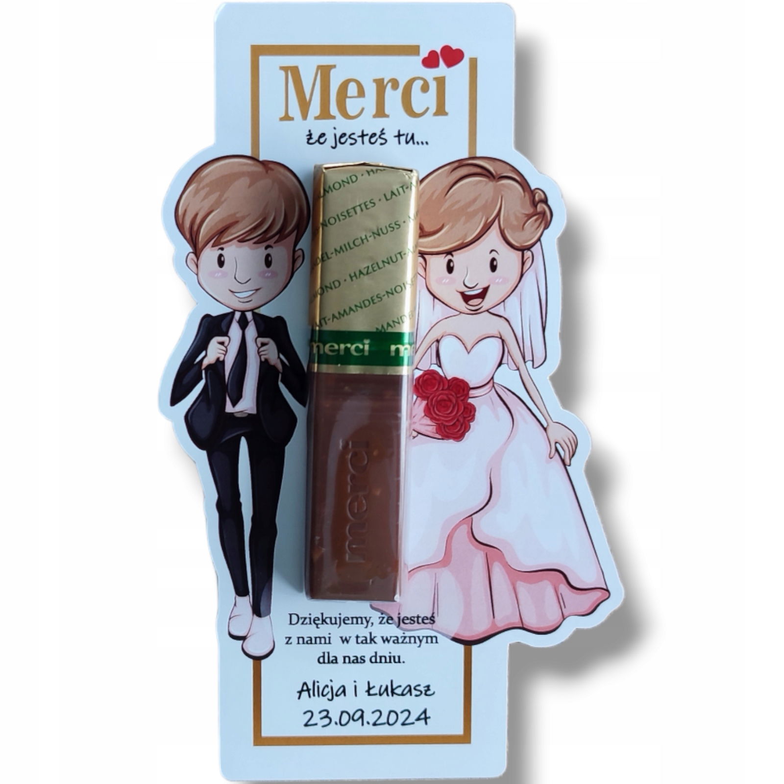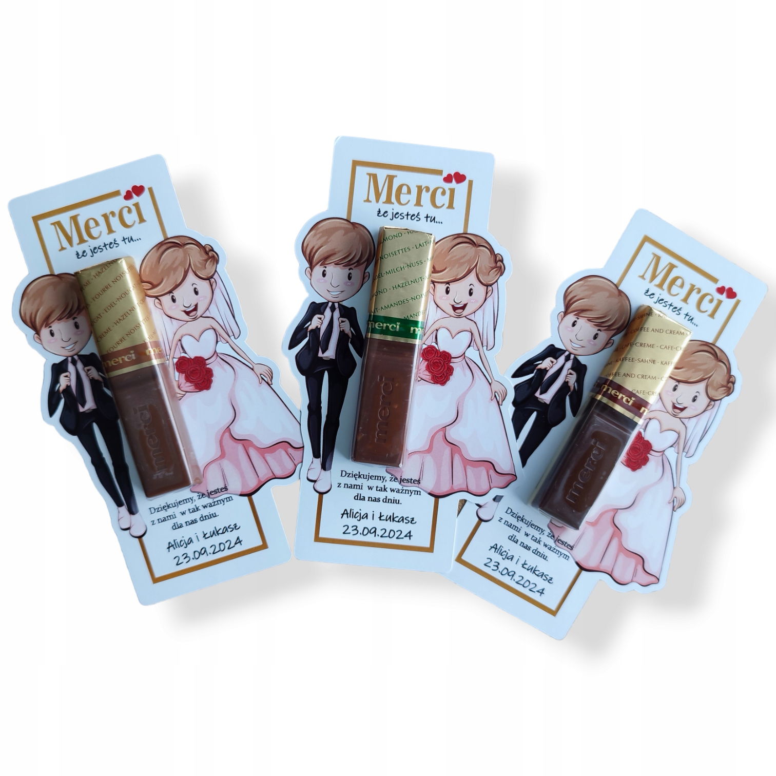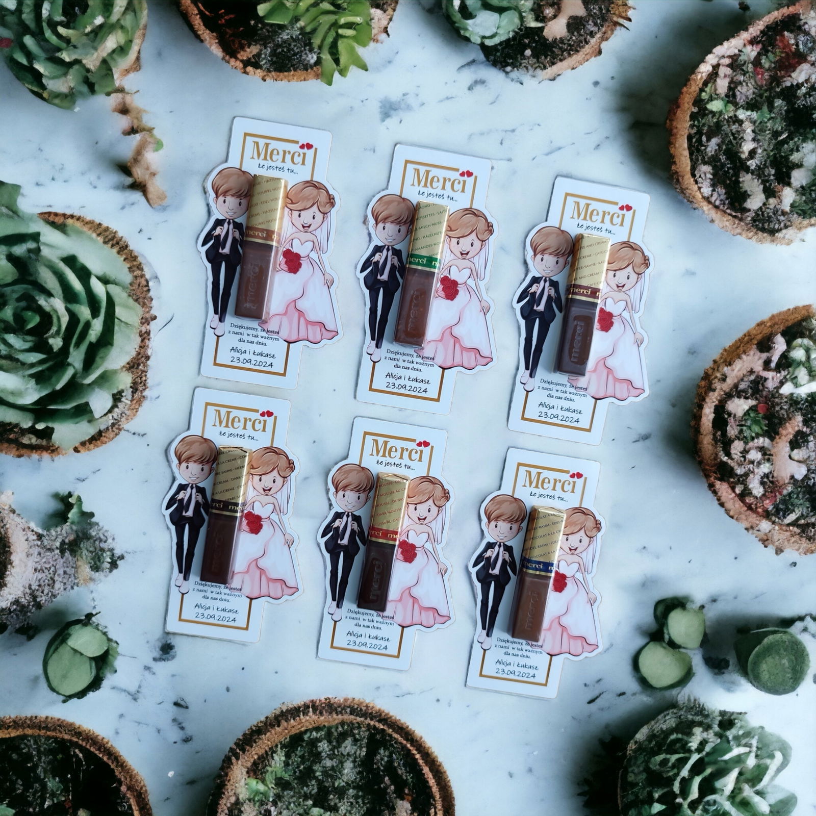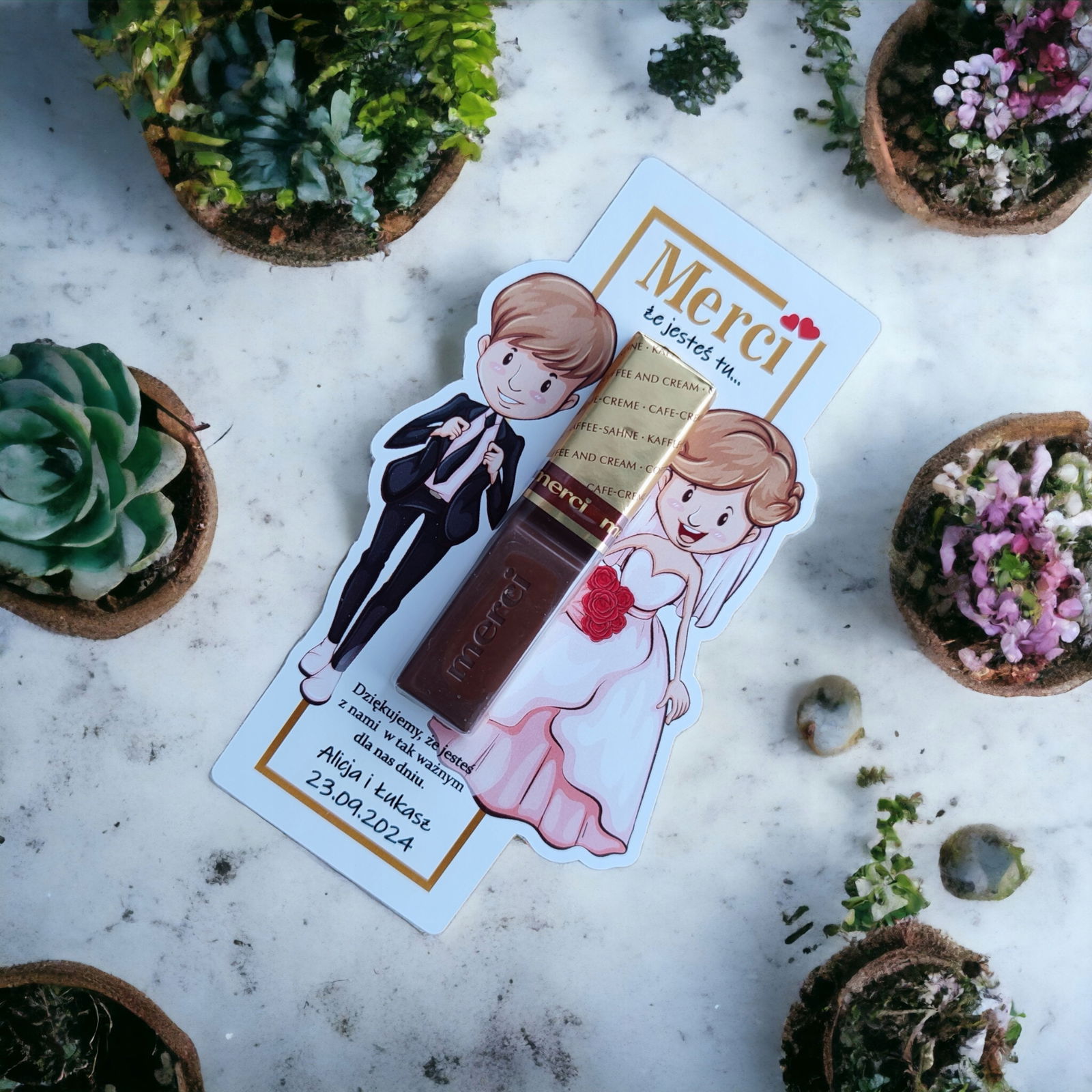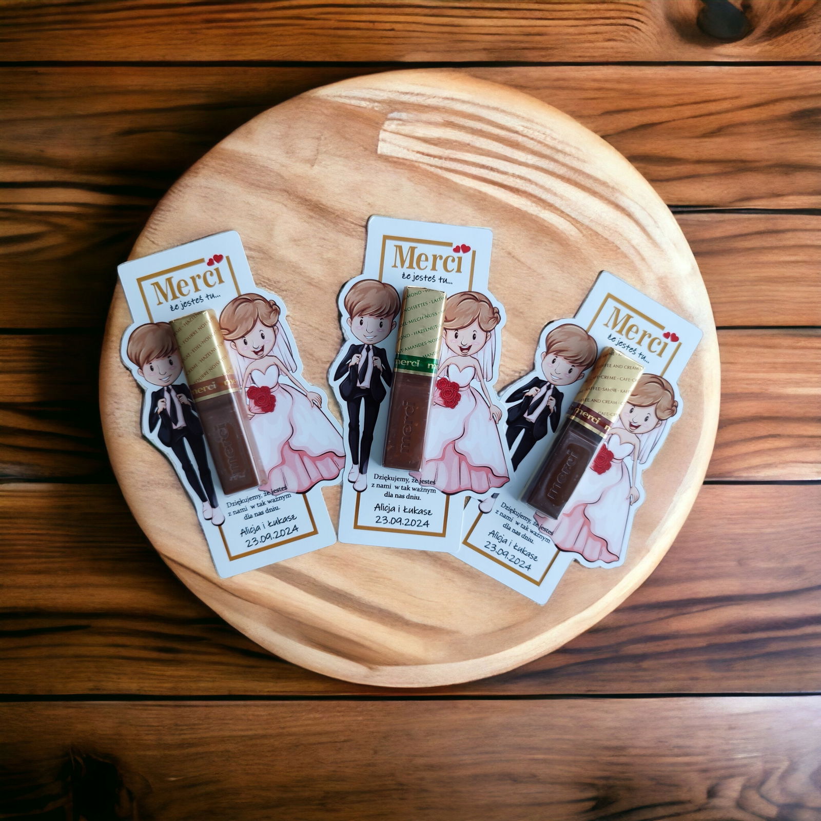 Podkładki na czekoladki Merci jako podziękowania na ślub, wesele .Oryginalny pomysł na podziękowanie w formie podkładki do czekoladek.