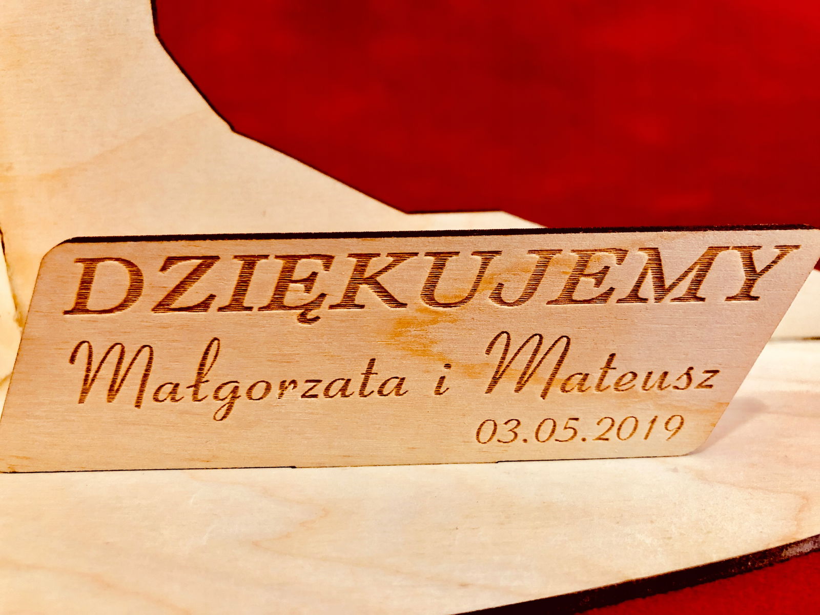 Przepięknie wycięte ze sklejki i grawerowane drzewko z podziękowaniami dla rodziców.