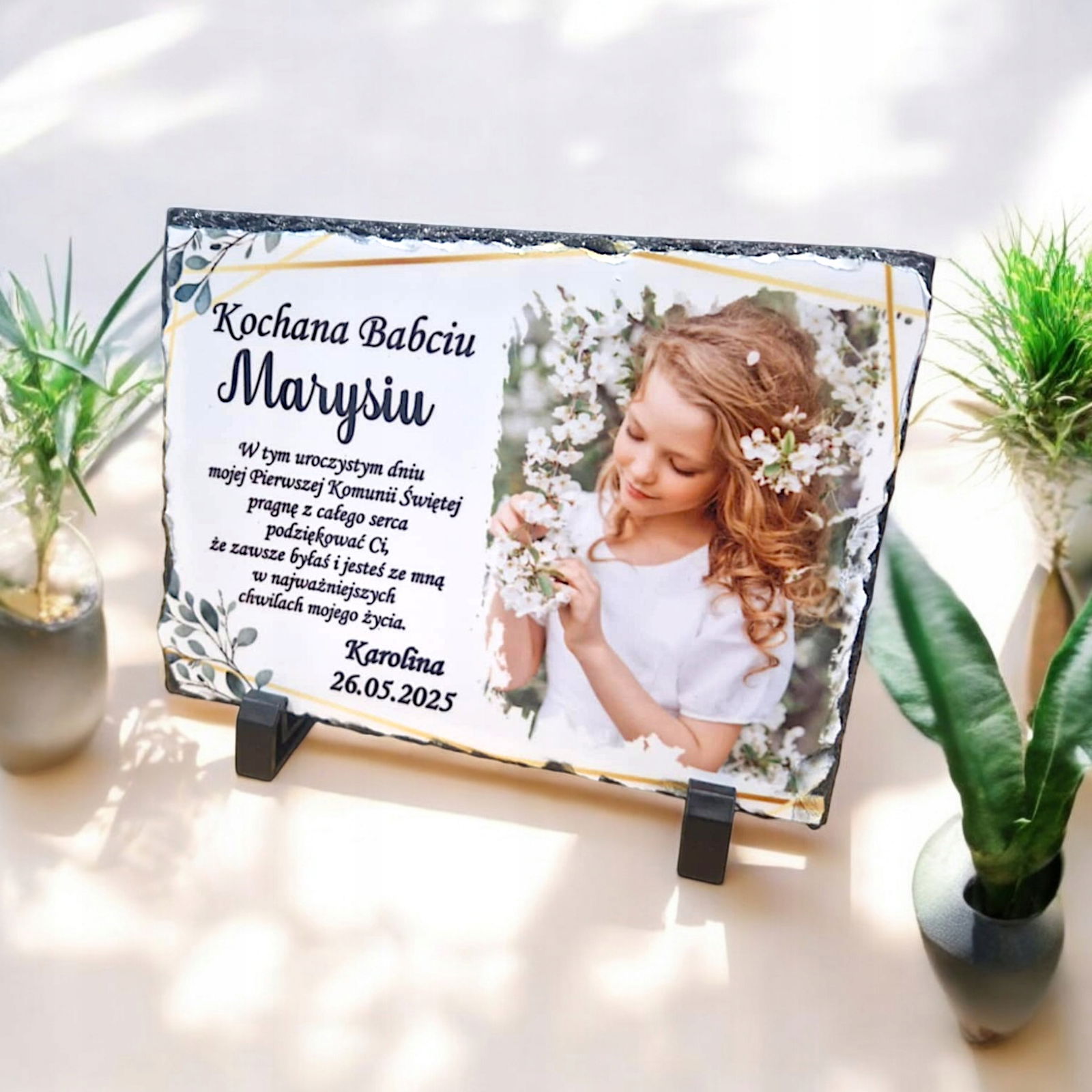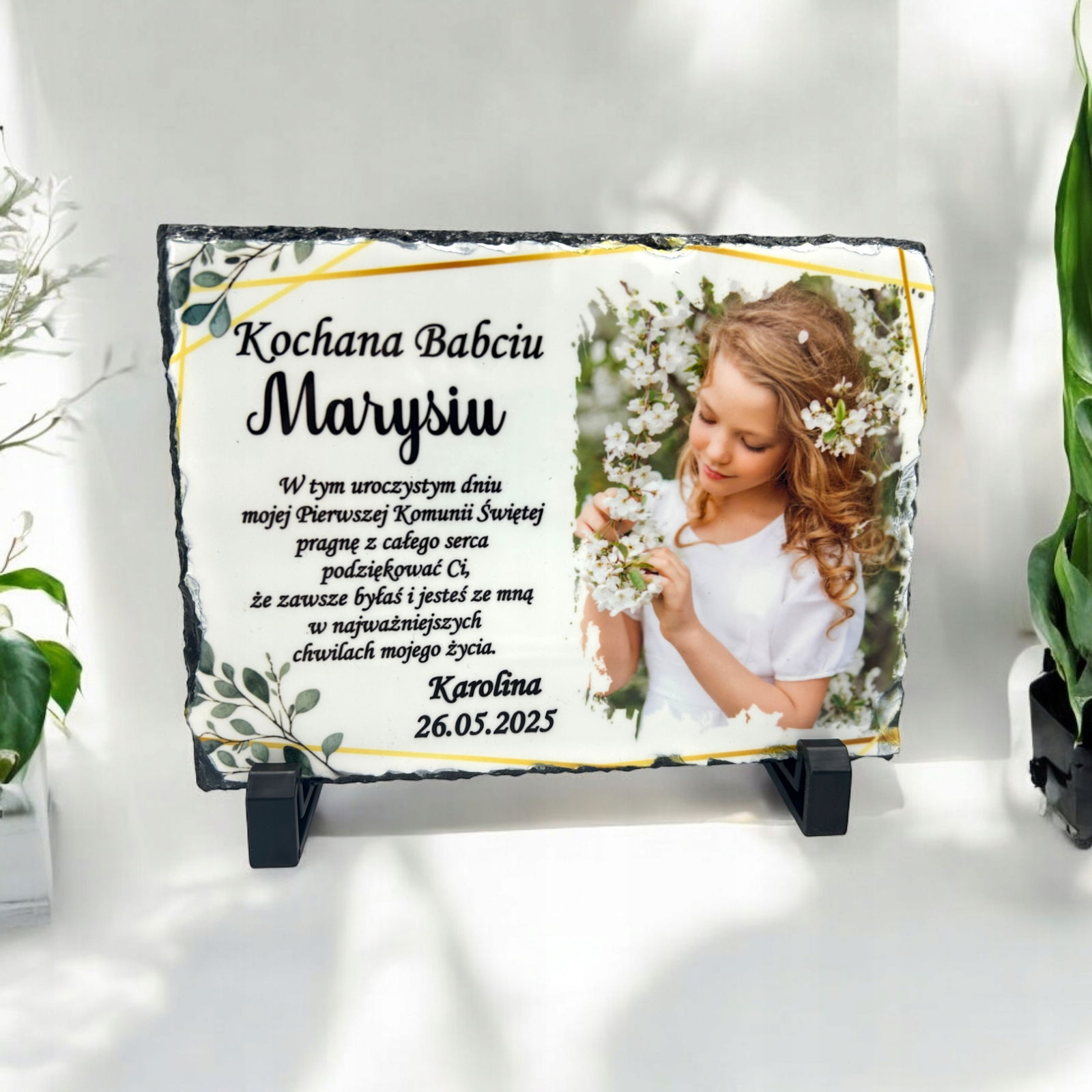 Tabliczka z płyty granitowej z dedykacją oraz zdjęciem dziecka – idealne podziękowanie z okazji Pierwszej Komunii Świętej.