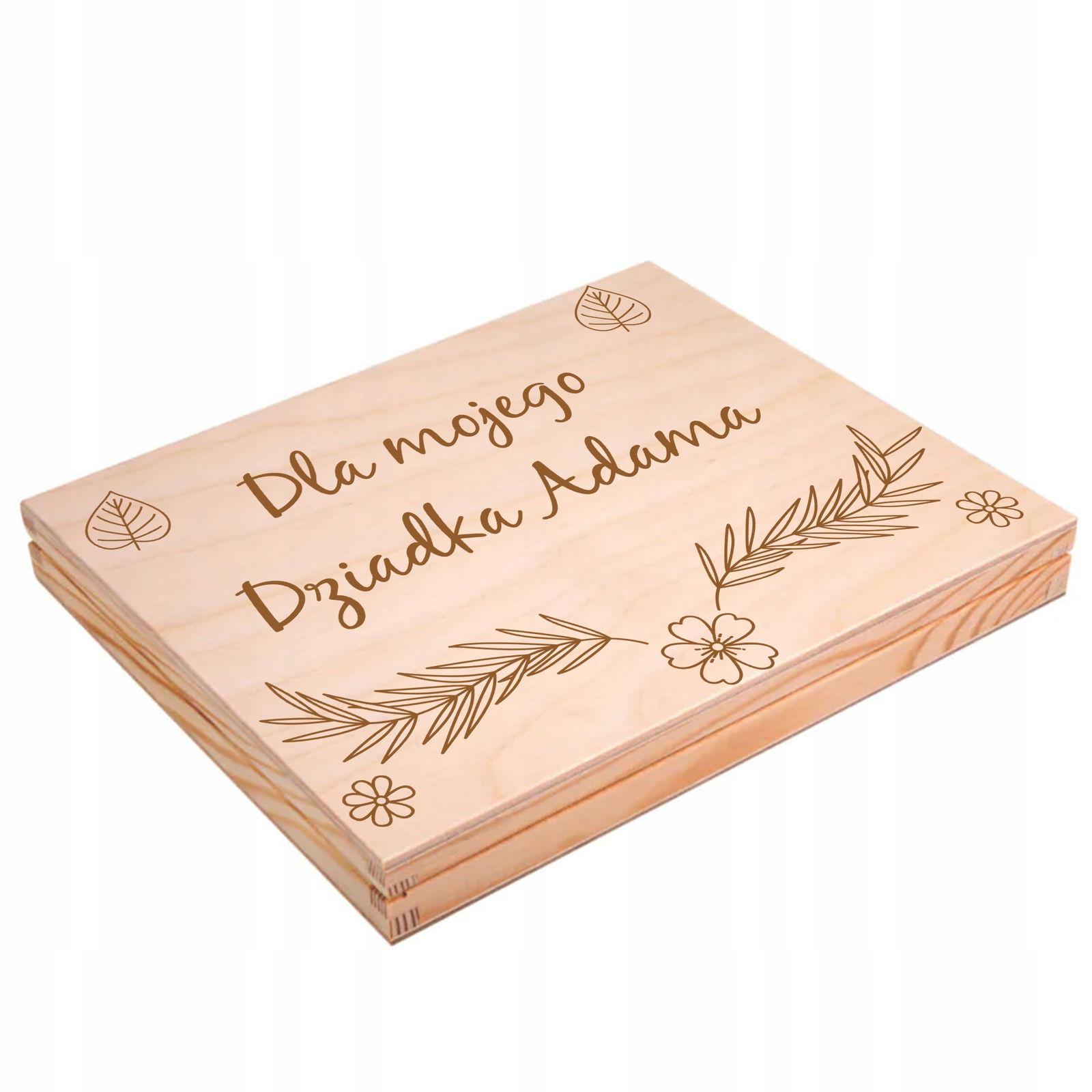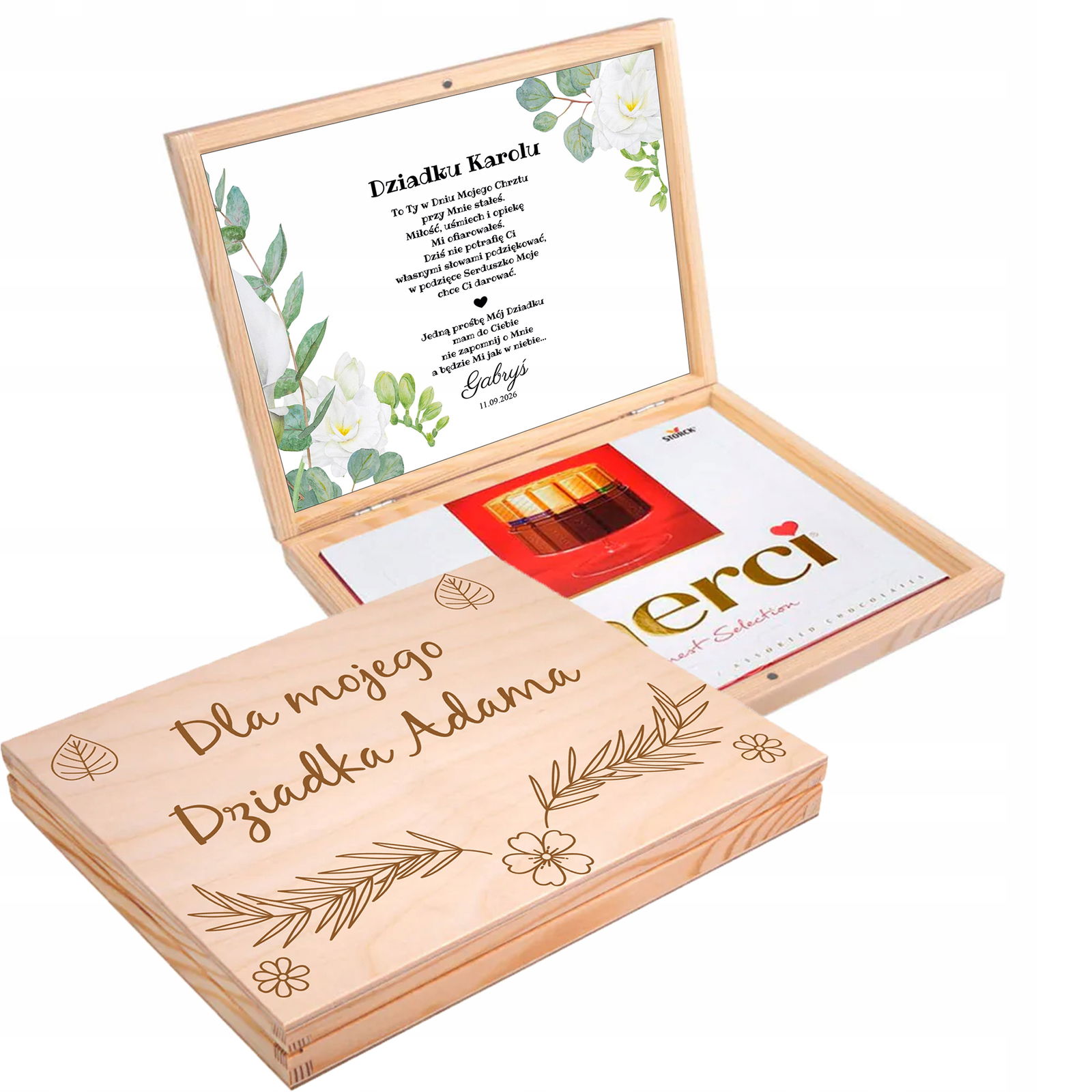 Drewniane pudełko z grawerem zostało wypełnione naklejką z tekstem oraz uroczą grafiką  kwiatów. Wewnątrz znajdują się również słodkie czekoladki Merci. To wyjątkowy, personalizowany prezent, który bez wątpienia pozostanie zapamiętany.