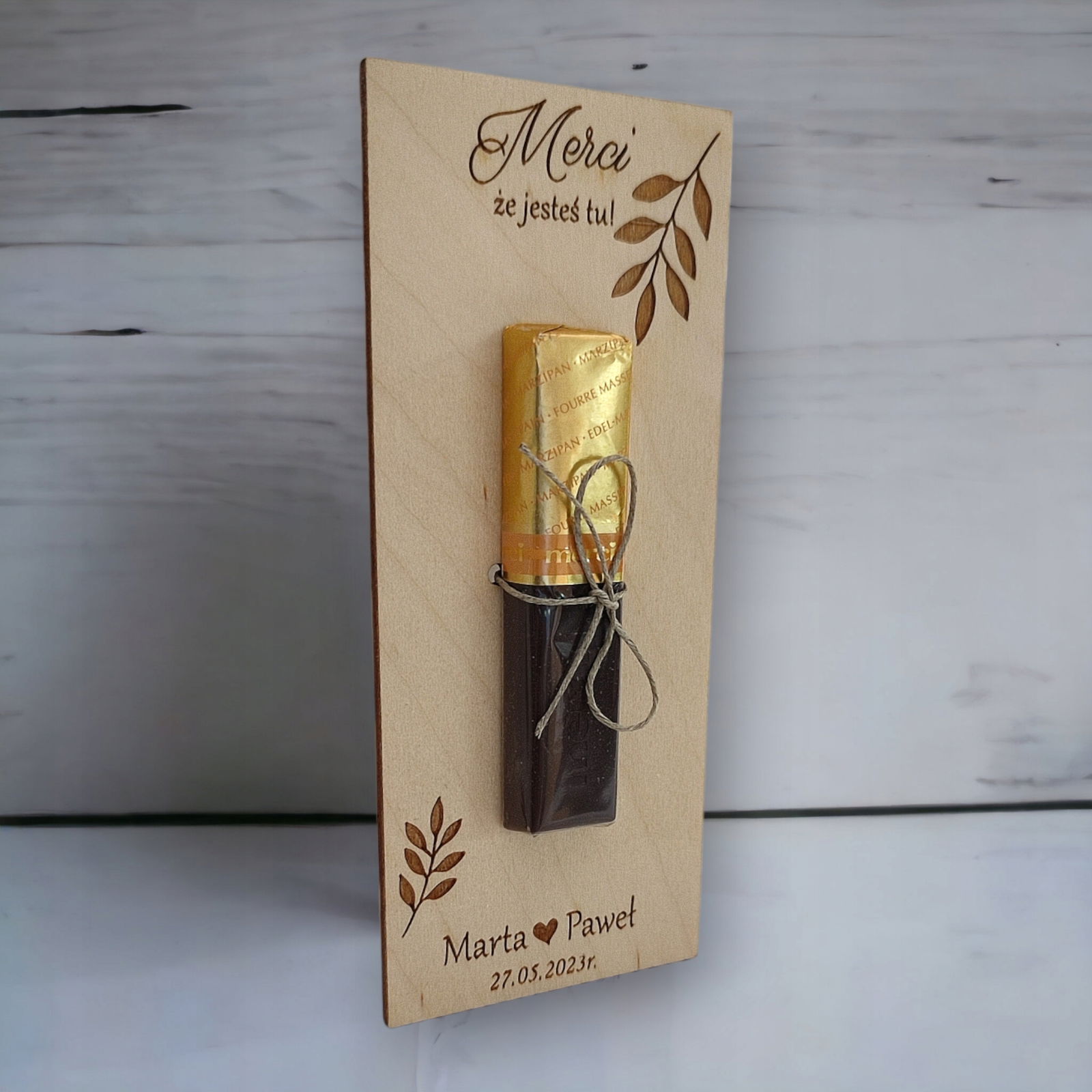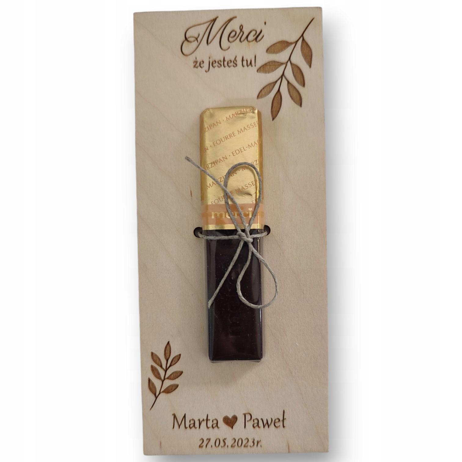 Drewniane podziękowanie na czekoladkę merci z okazji ślubu.
