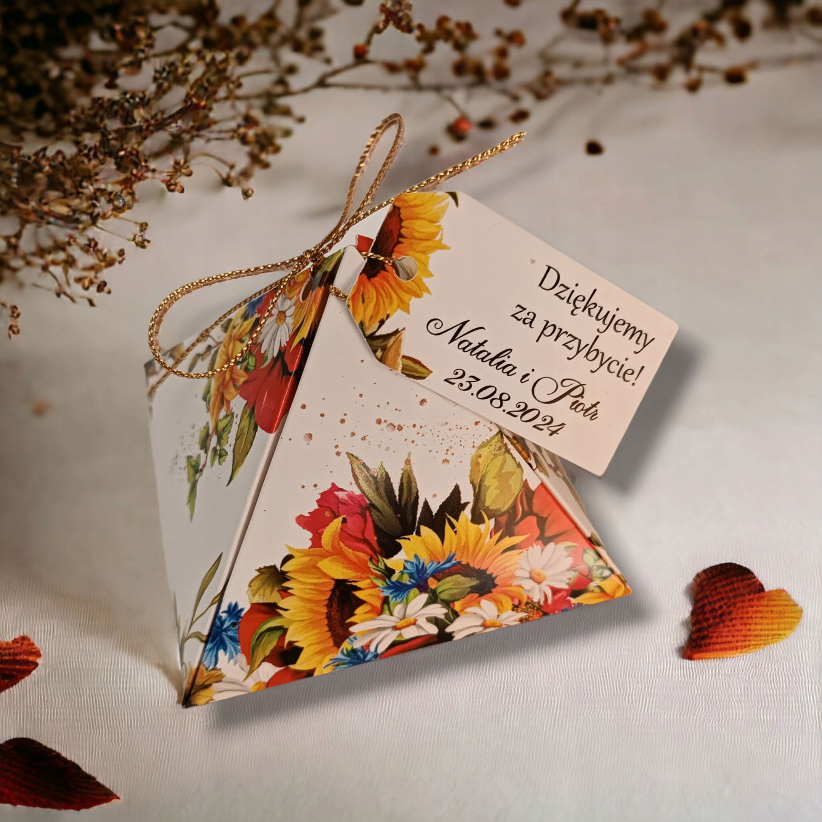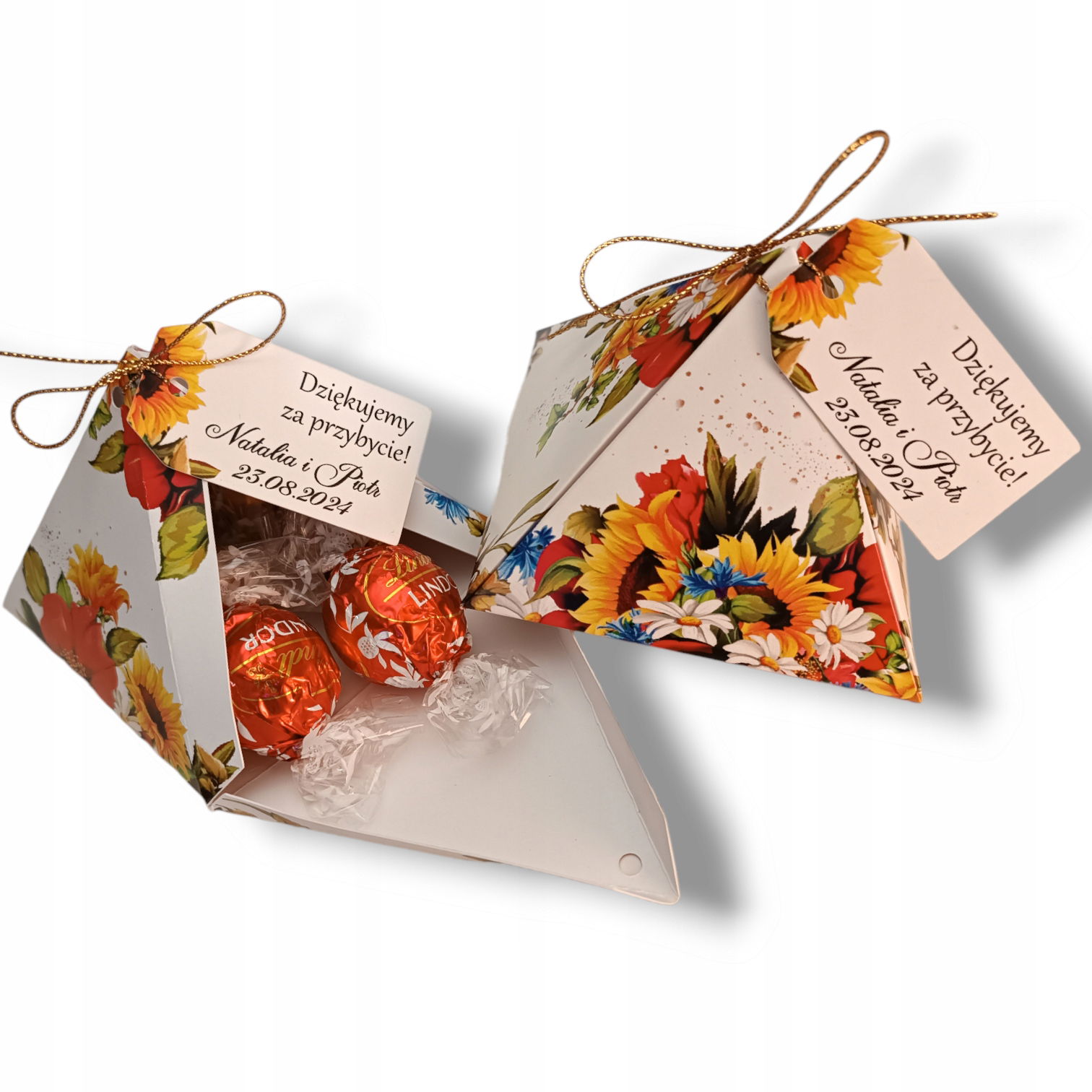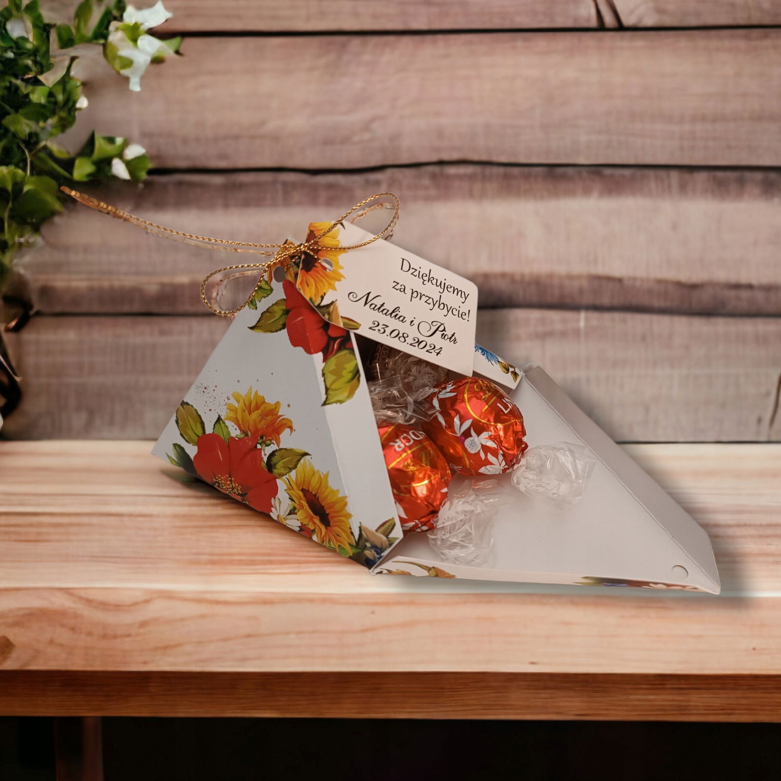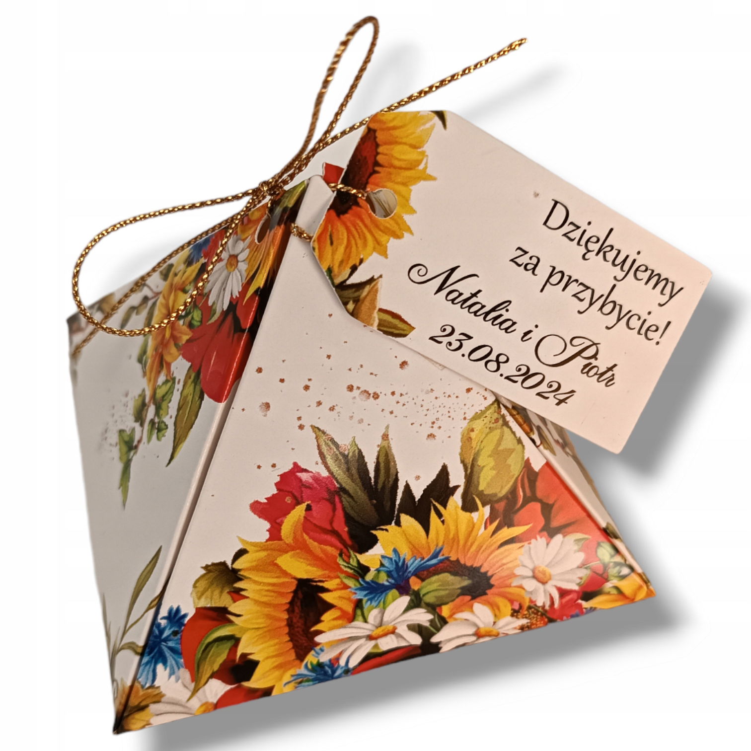 Chcecie elegancko zapakować podziękowania dla gości? Możecie to uczynić w niebanalny sposób, dzięki wykorzystaniu naszych stylowych pudełeczek piramidek. Są one idealne do zapakowania dowolnych drobnych upominków (pralinki, krówki, żelki, figurki itp) Na pewno przypadną do gustu wszystkim zaproszonym. Będą też wyrazem wdzięczności za przybycie i przeżywanie z Wami tego szczególnego dnia, pozwolą poczuć się im wyjątkowo. Pięknie prezentują się przy nakryciach dla Gości.