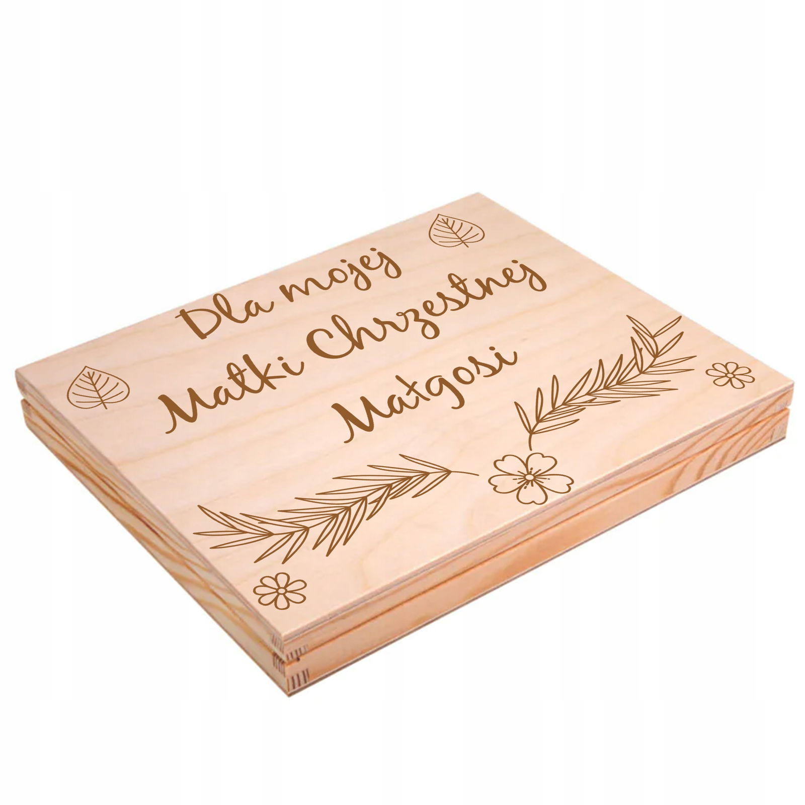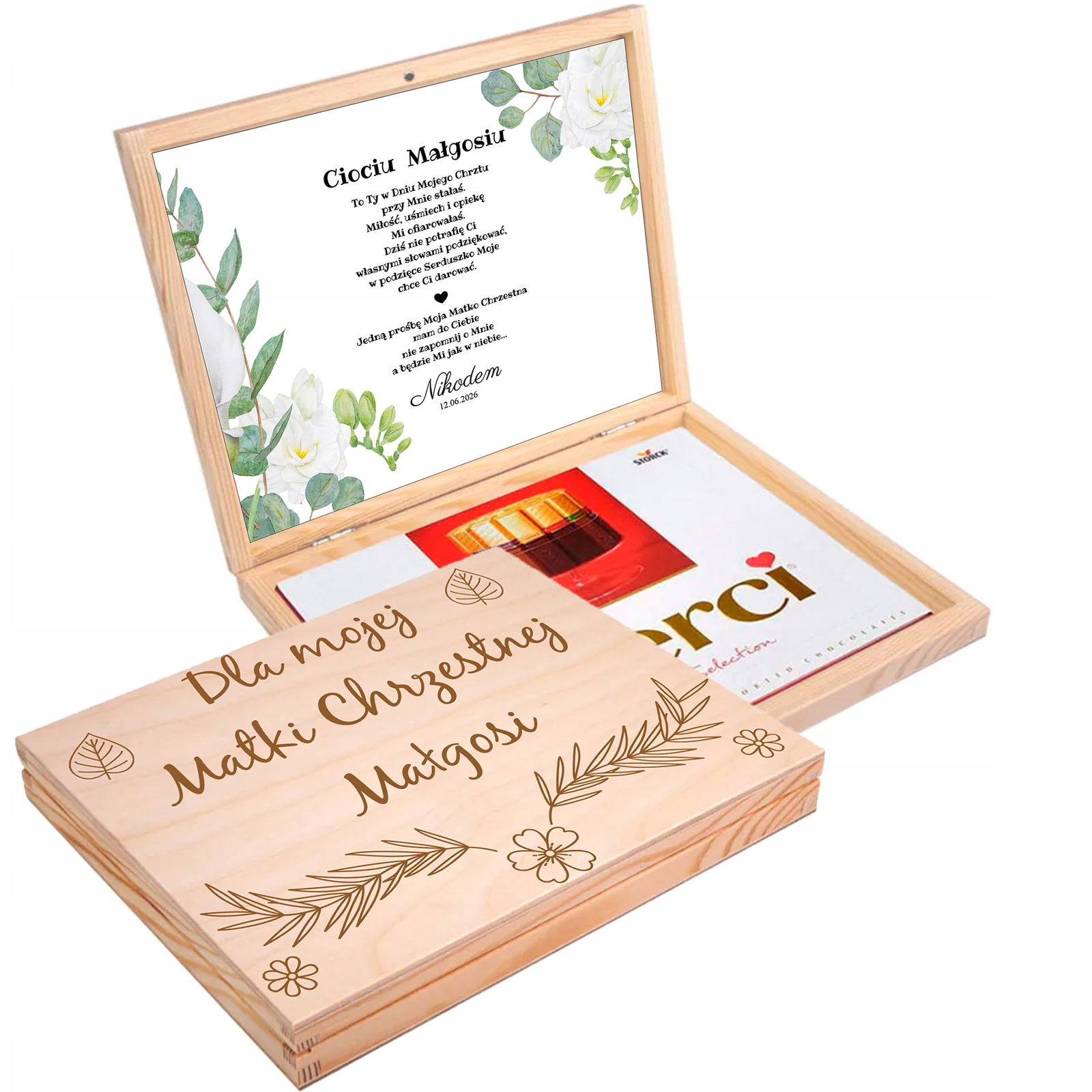 Drewniane pudełko z grawerem zostało wypełnione naklejką z tekstem oraz uroczą grafiką  kwiatów. Wewnątrz znajdują się również słodkie czekoladki Merci. To wyjątkowy, personalizowany prezent, który bez wątpienia pozostanie zapamiętany.