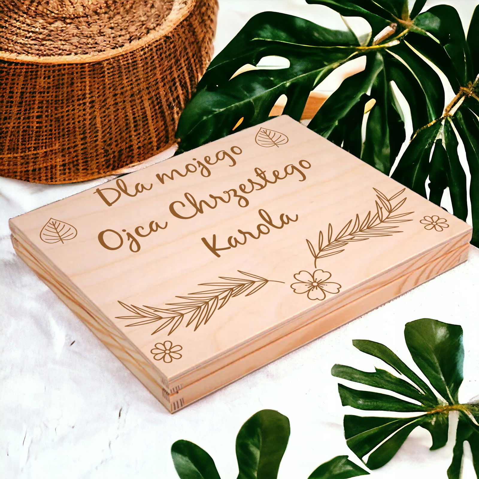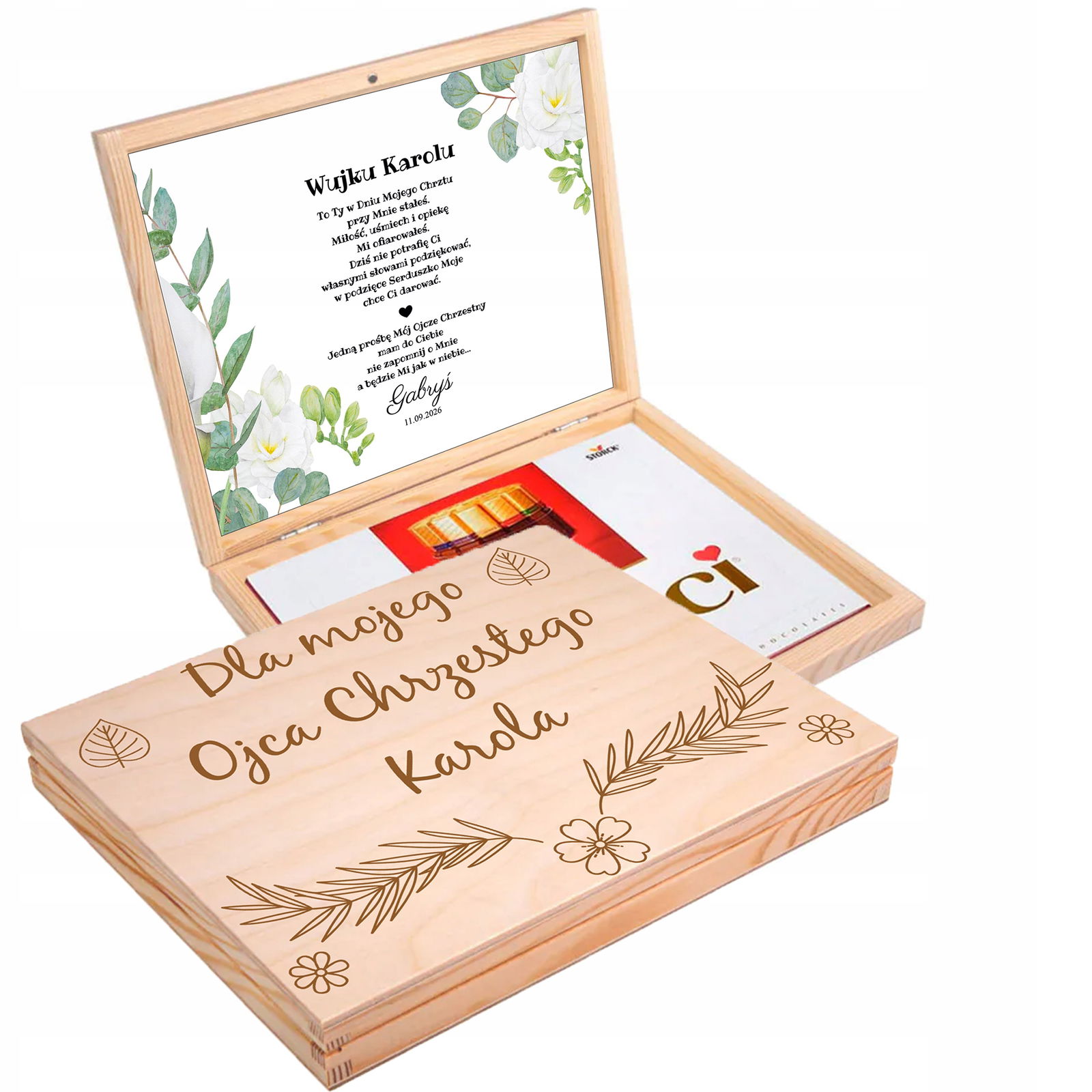 Drewniane pudełko z grawerem zostało wypełnione naklejką z tekstem oraz uroczą grafiką  kwiatów. Wewnątrz znajdują się również słodkie czekoladki Merci. To wyjątkowy, personalizowany prezent, który bez wątpienia pozostanie zapamiętany.