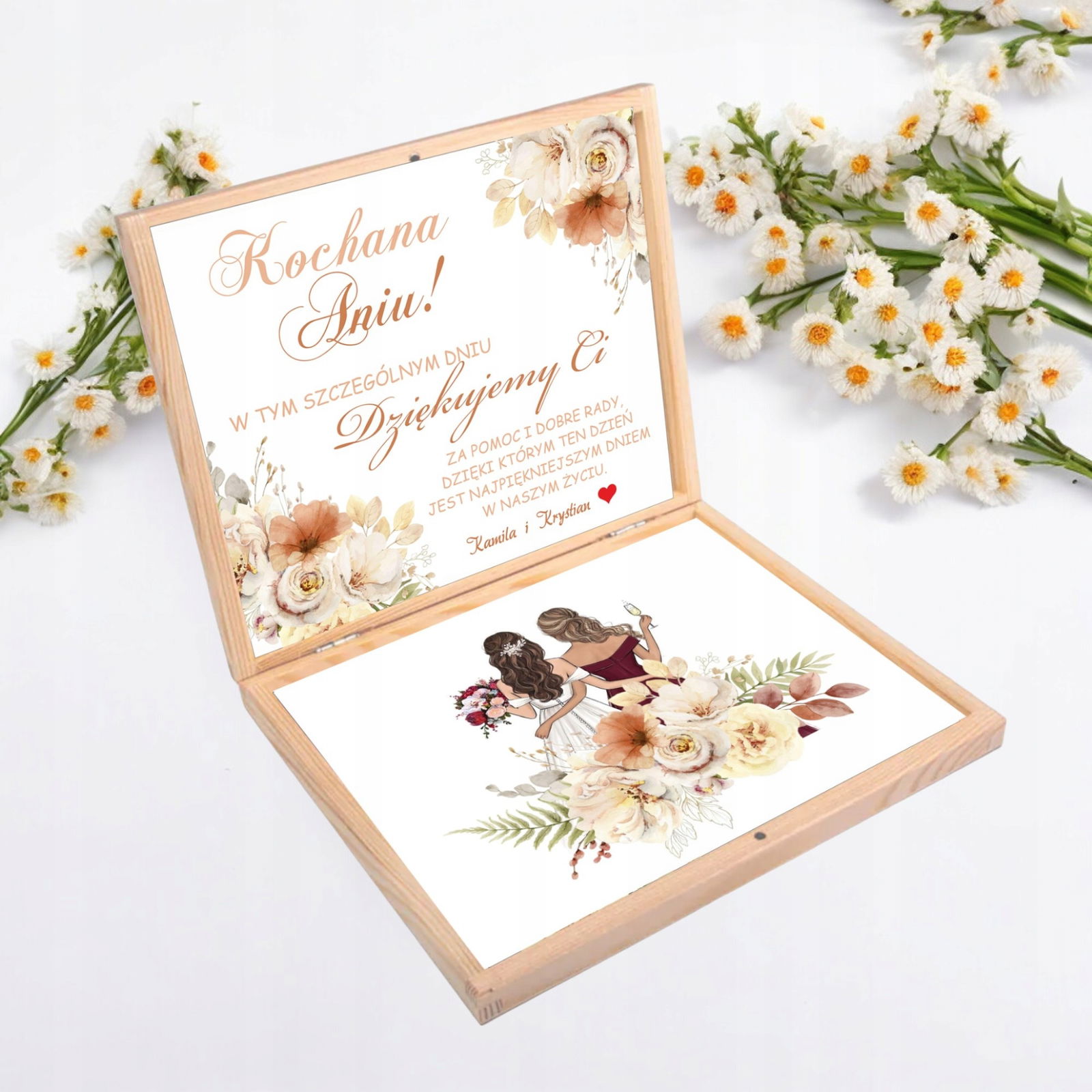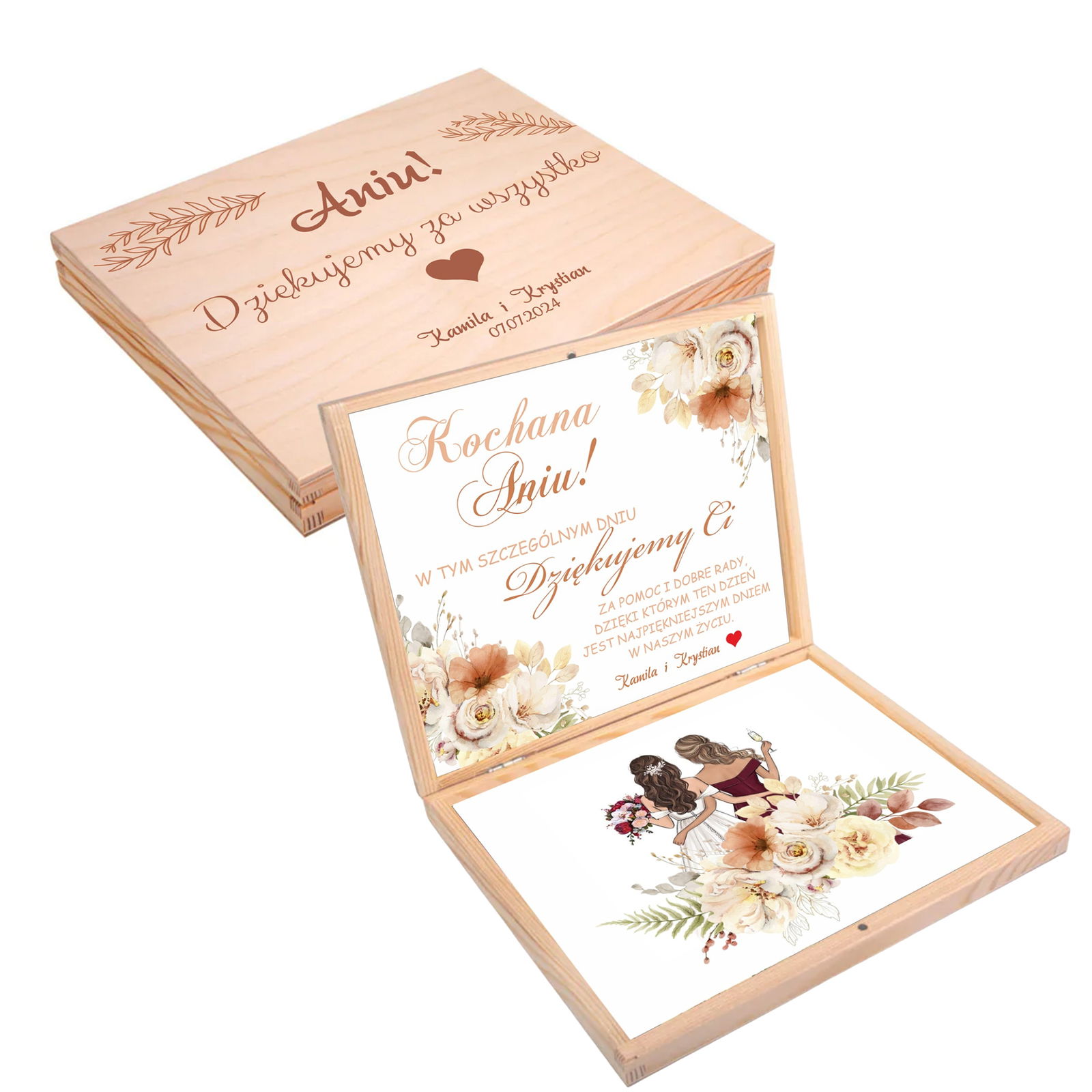 PODZIĘKUJ SWOJEJ ŚWIADKOWEJ W WYJĄTKOWY SPOSÓB. WYBIERZ ELEGANCKIE PUDEŁKO ZE SPERSONALIZOWANYM GRAWEREM.