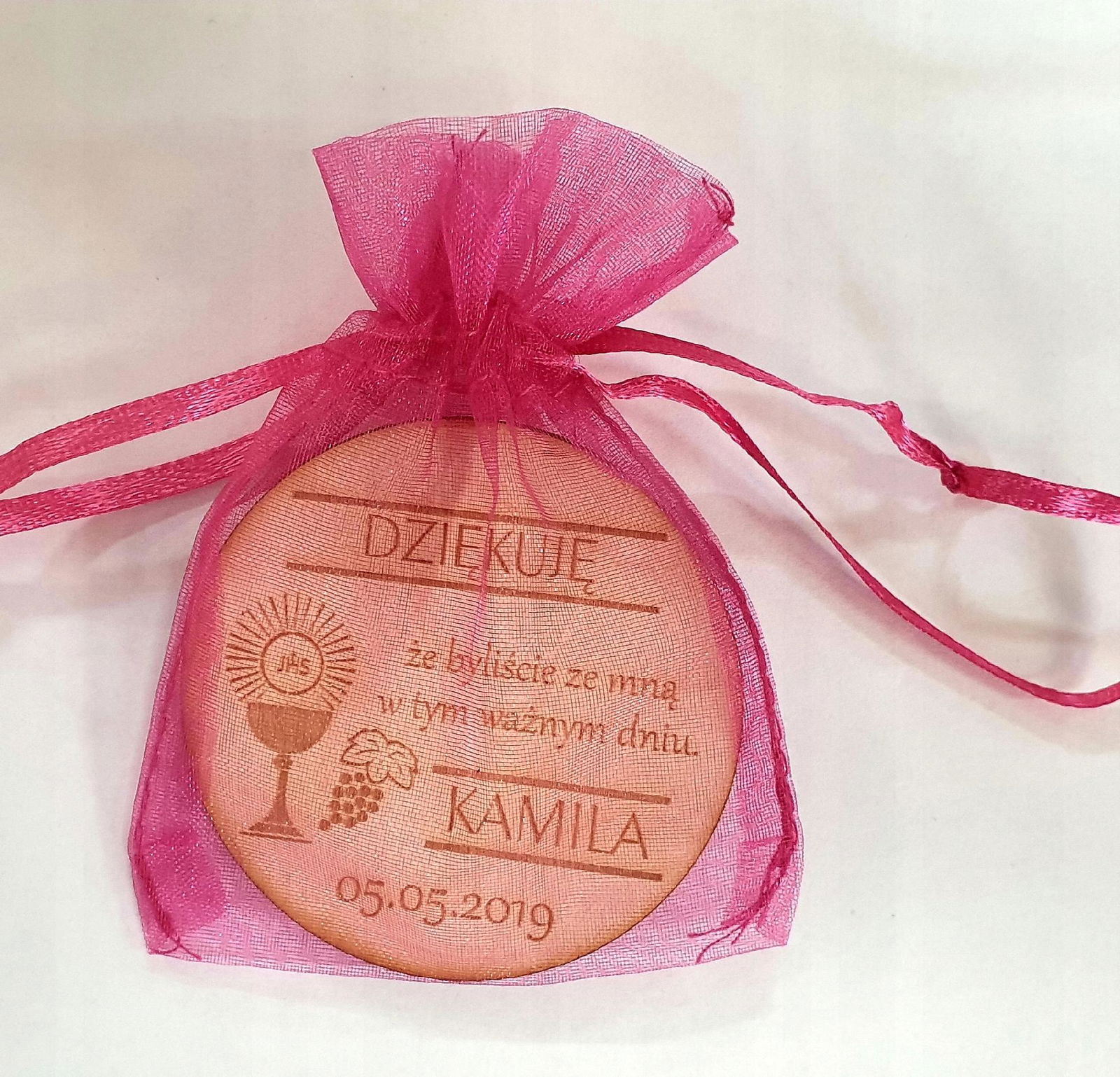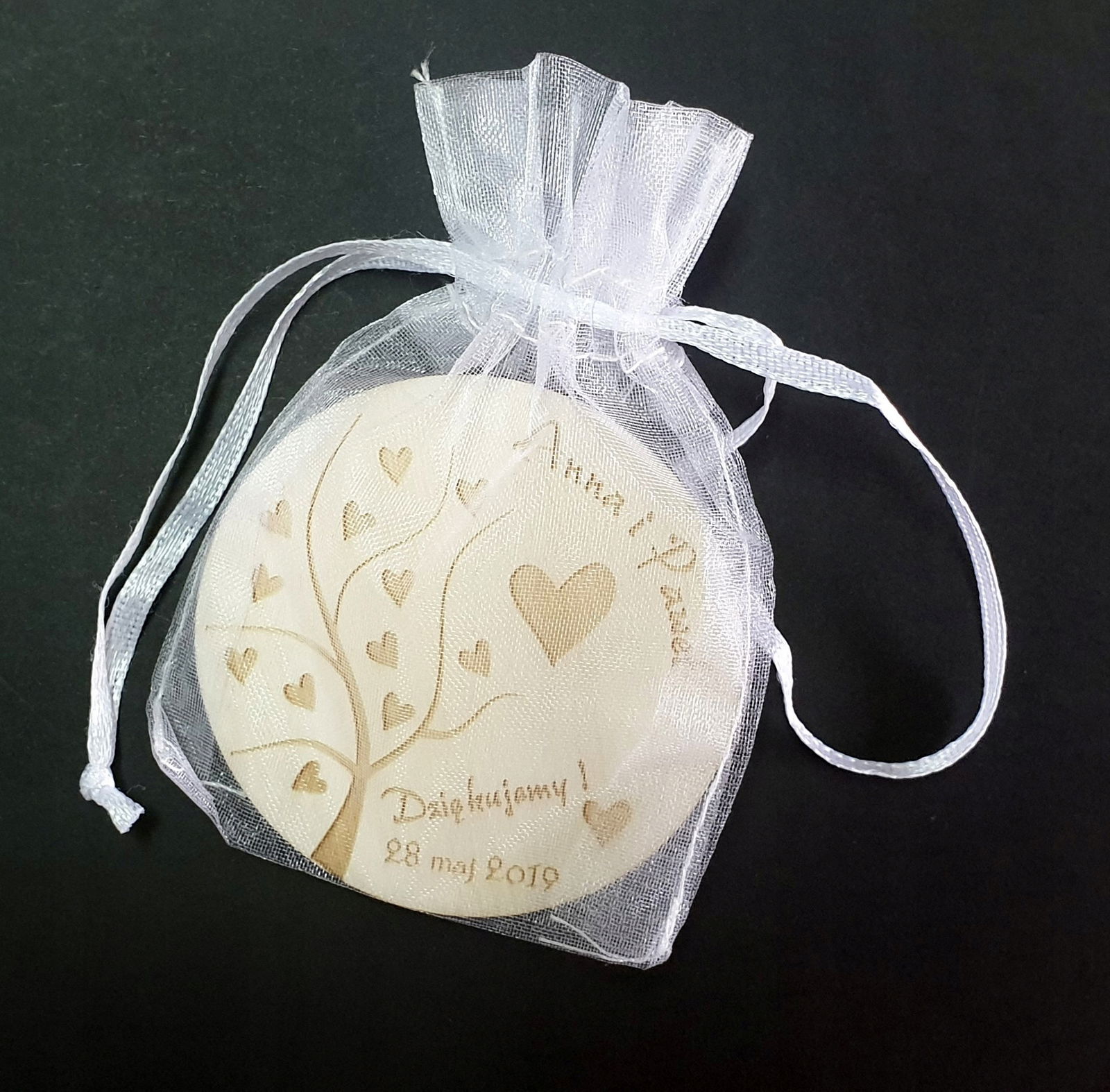 Istnieje możliwość DOKUPIENIA opcji spakowania podziękowania do woreczka z organzy w kolorze niebieskim, białym lub różowym.
