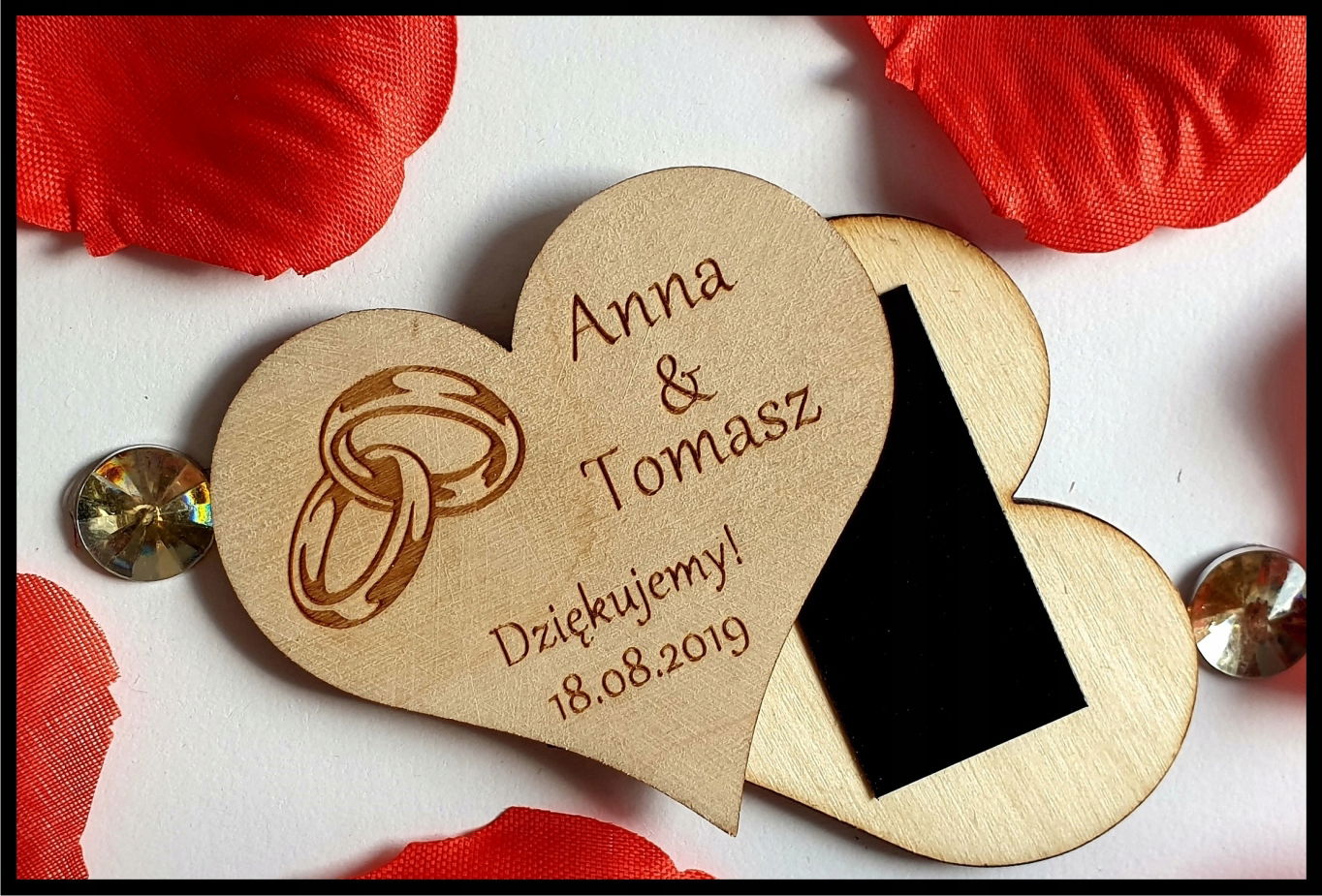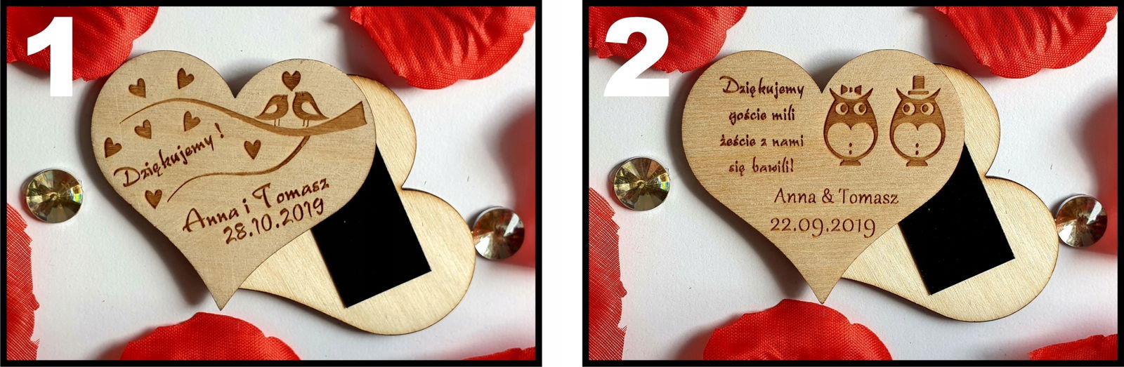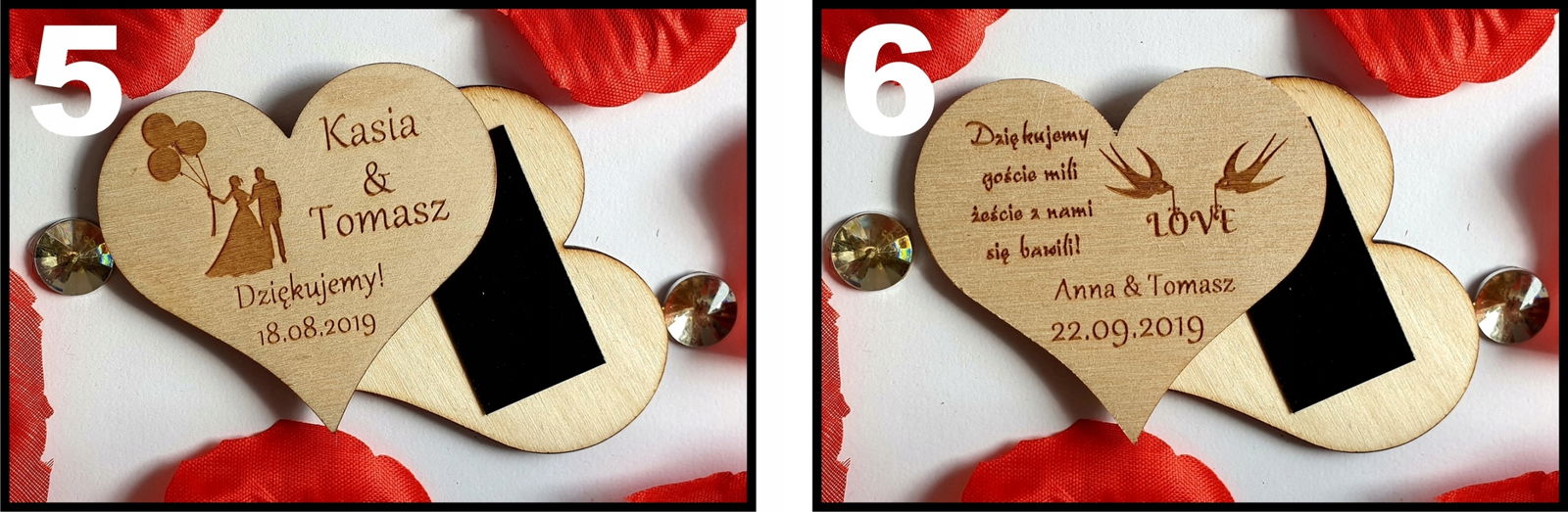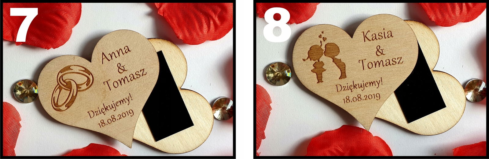 Mamy do zaoferowania eleganckie podziękowania dla gości na wesele, chrzest  w formie drewnianych magnesów na lodówkę.