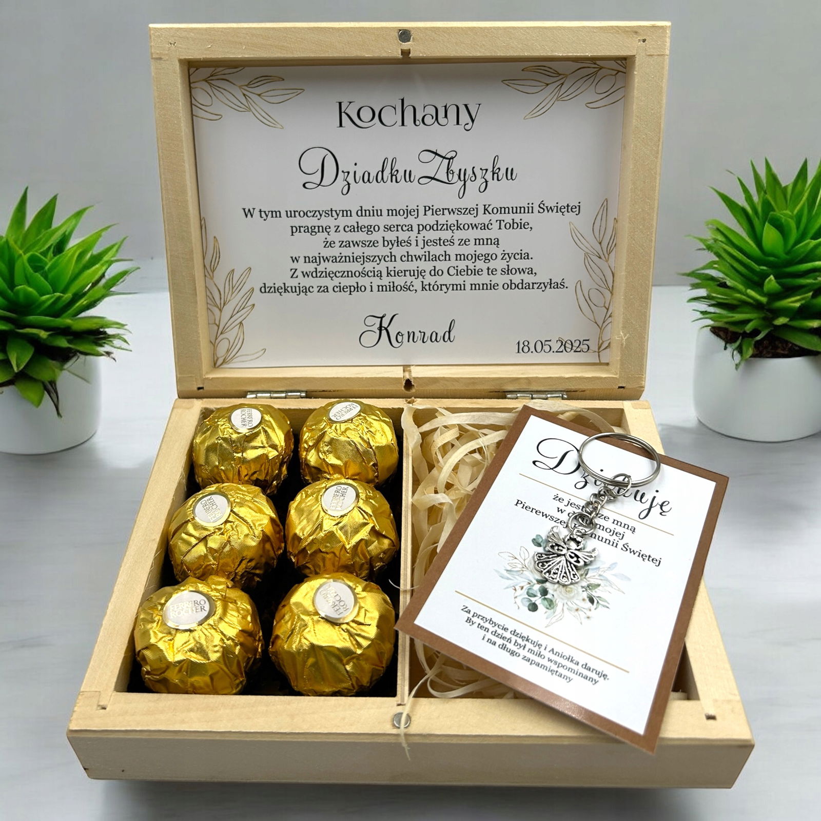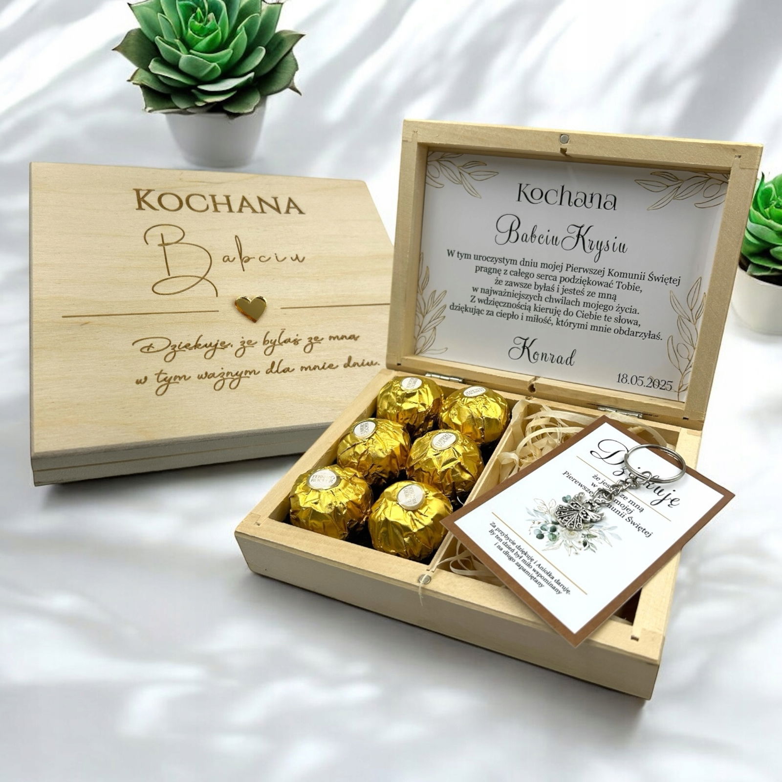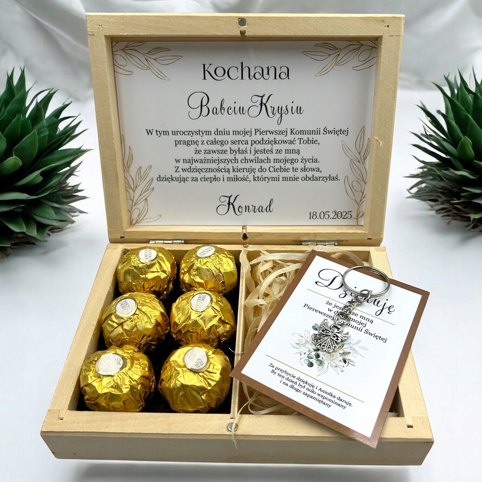 Drewniane pudełko z grawerem zostało wypełnione naklejką z tekstem oraz uroczą grafiką kwiatów. Wewnątrz znajdują się miejsce na słodkie czekoladki Ferrero. To wyjątkowy, personalizowany prezent, który bez wątpienia pozostanie zapamiętany.