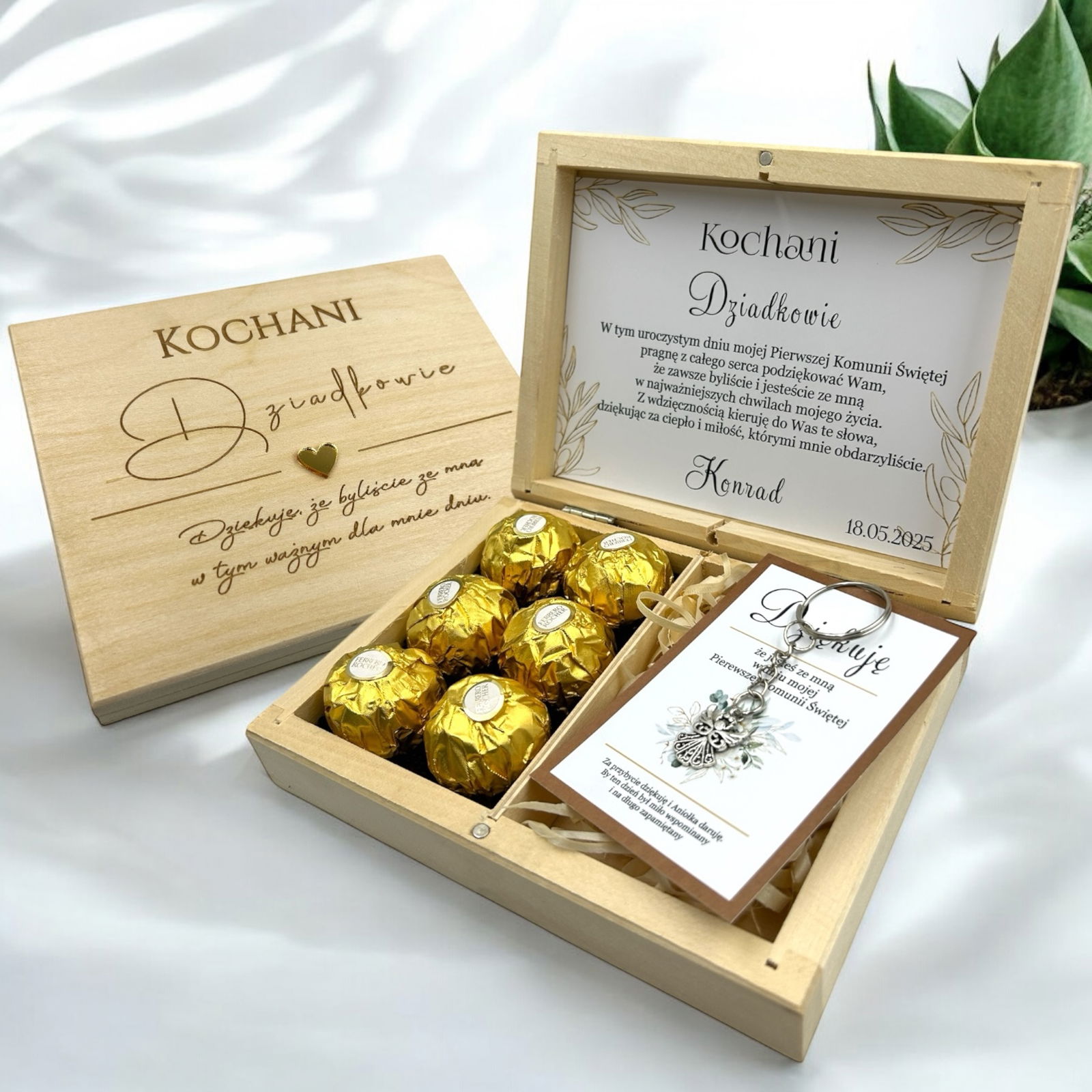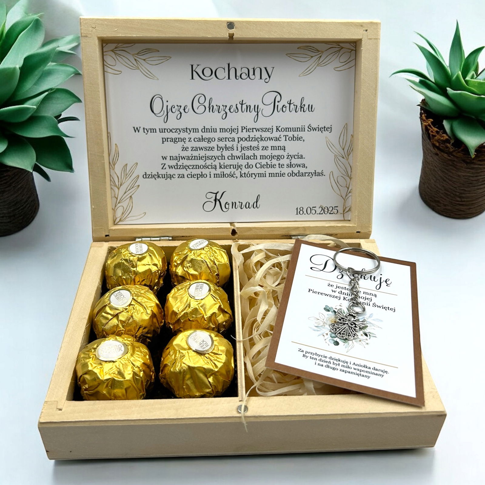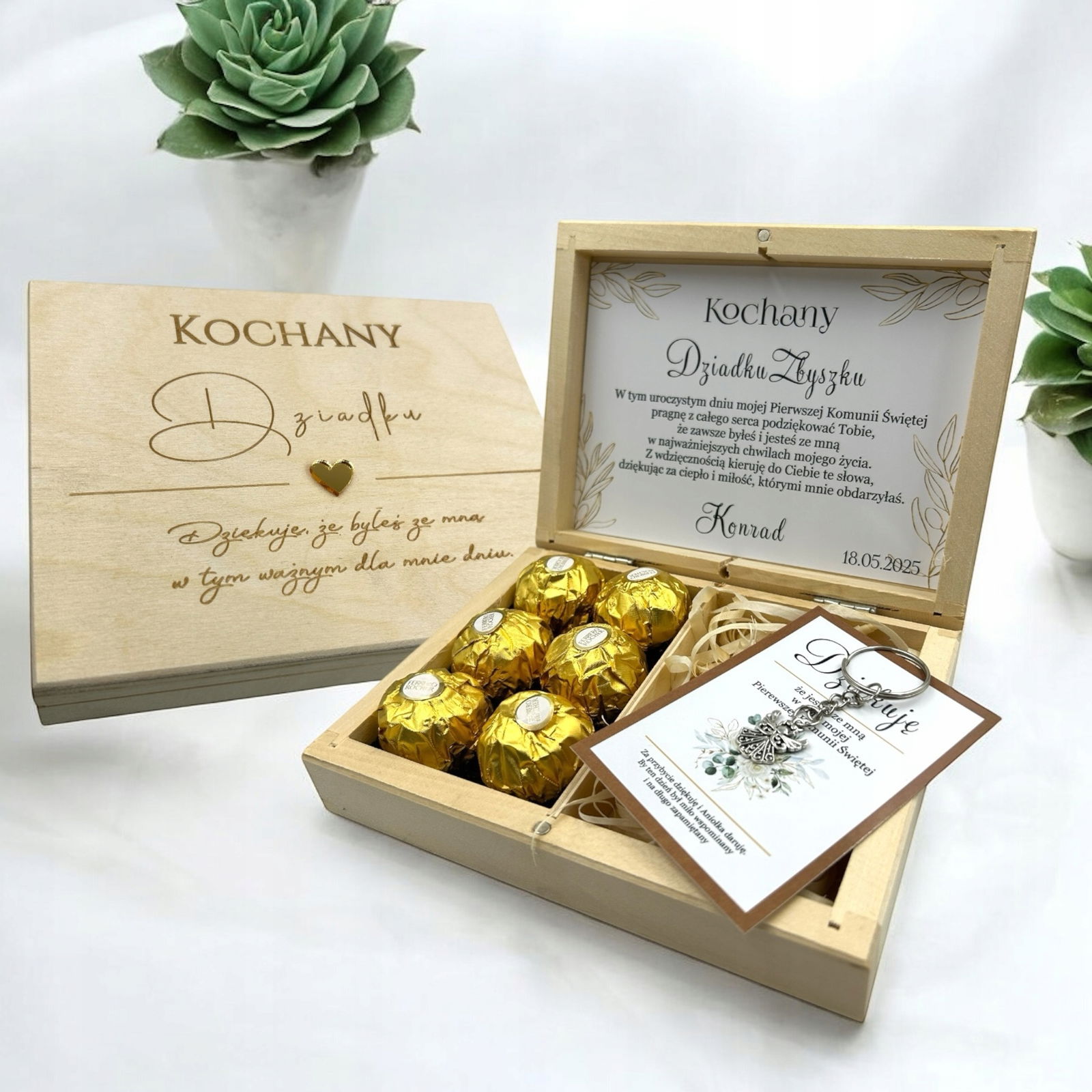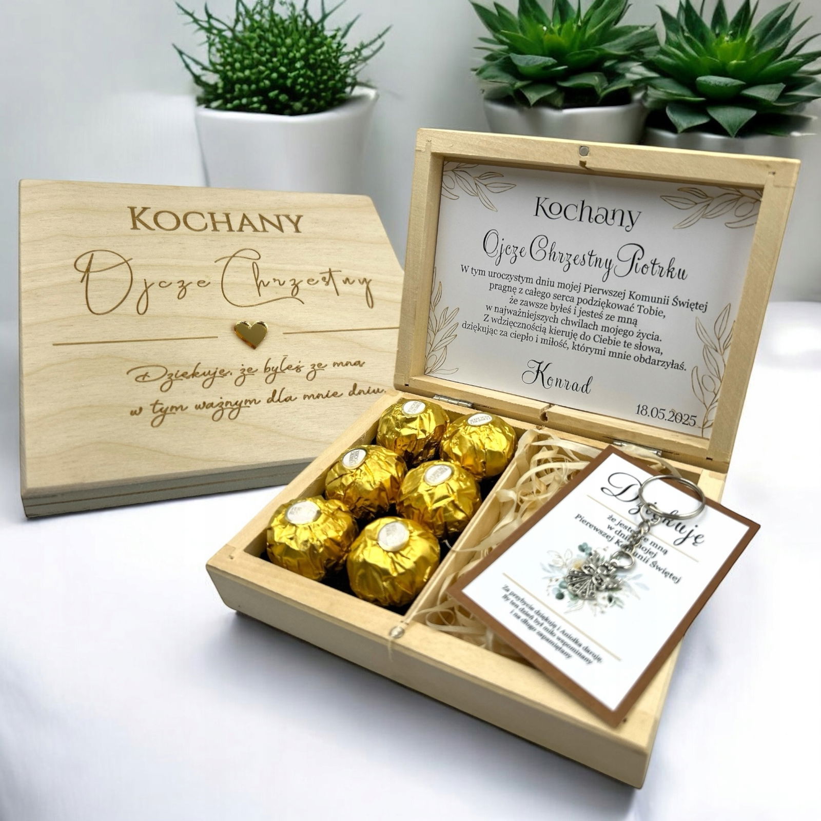 Drewniane pudełko z grawerem zostało wypełnione naklejką z tekstem oraz uroczą grafiką kwiatów. Wewnątrz znajdują się miejsce na słodkie czekoladki Ferrero. To wyjątkowy, personalizowany prezent, który bez wątpienia pozostanie zapamiętany.