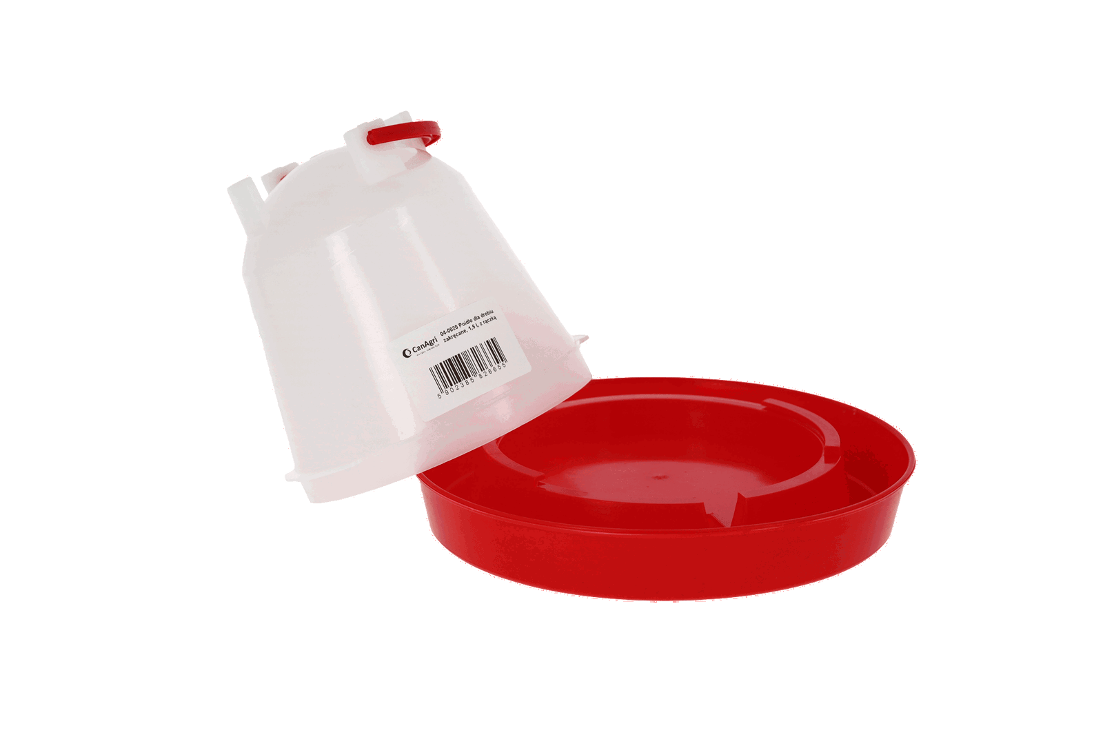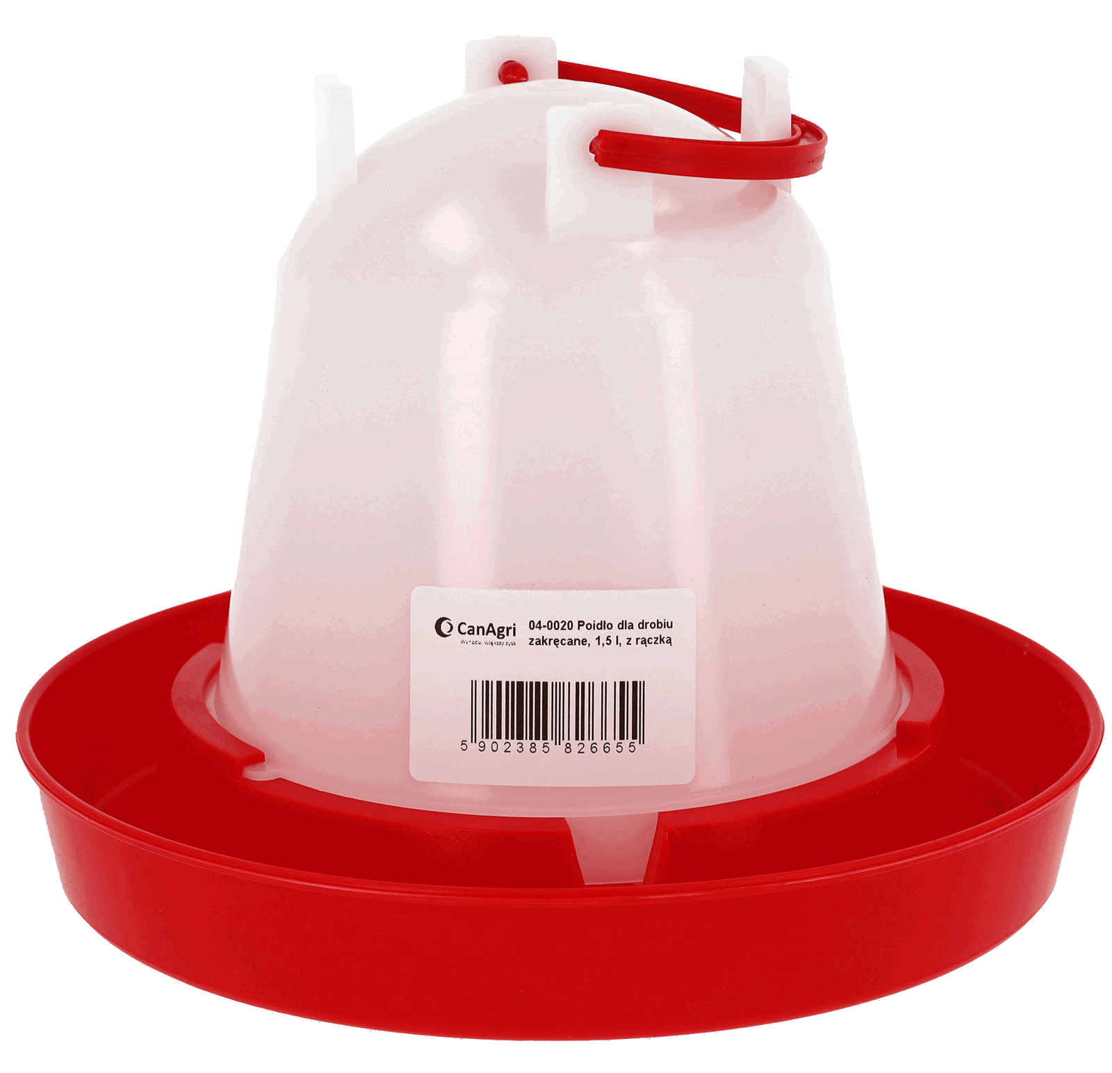 Poidło 1,5-litrowe zakręcane z rączką, idealne do hodowli drobiu oraz ptactwa ozdobnego. Transparentny zbiornik ułatwia kontrolę poziomu wody.