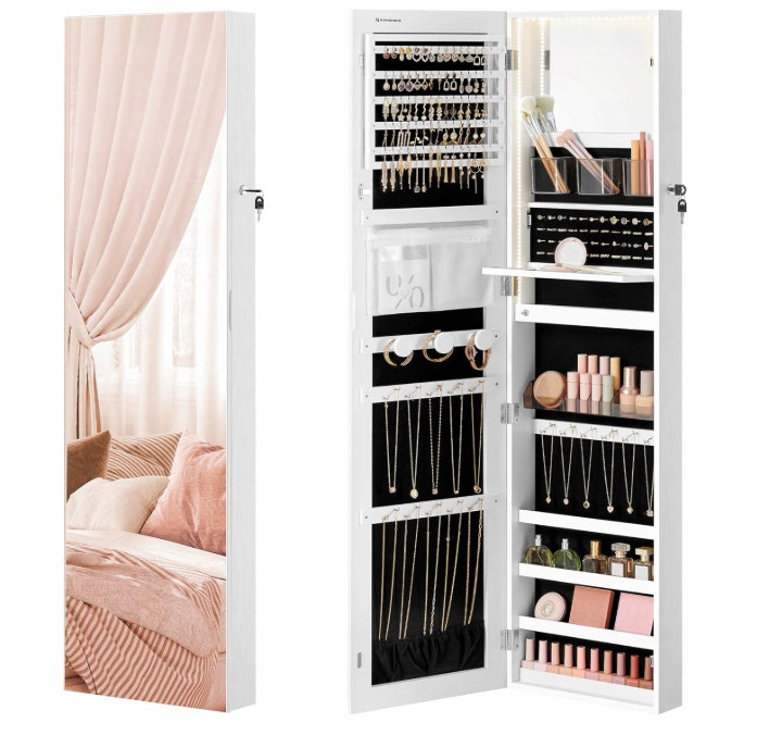 - ✴️【LUSTRO WEWNĘTRZNE Z PODŚWIETLENIEM】Szafka na biżuterię zawiera wewnętrzne lusterko, dzięki czemu nie trzeba ciągle otwierać i zamykać drzwiczek, aby się przeglądać podczas makijażu. W połączeniu z naturalnie wyglądającym oświetleniem LED, stanowi idealne uzupełnienie makijażu.