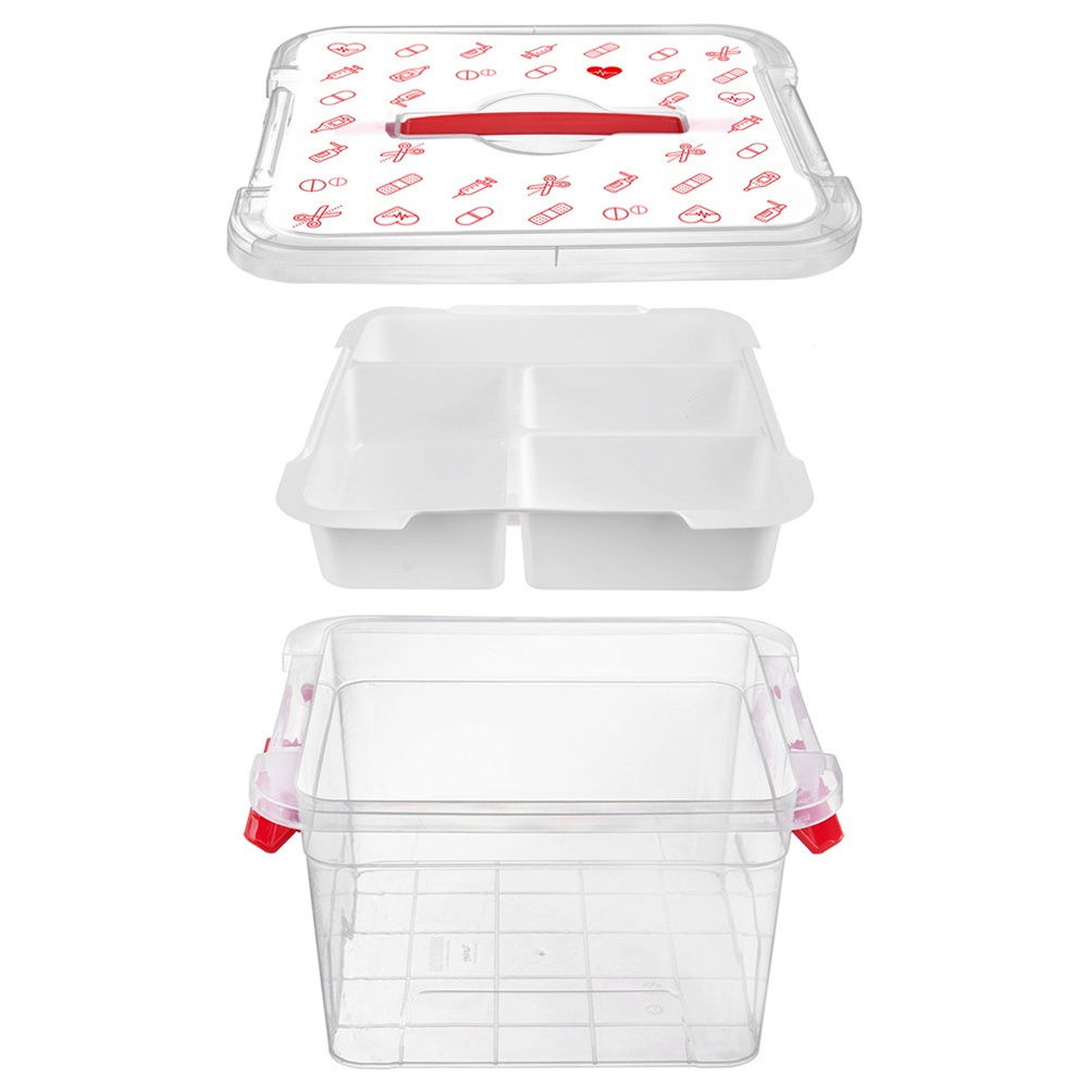 Medyczny nadruk na pokrywie - Pojemnik wykonany z tworzywa w przezroczystym kolorze. Wyjmowany organizer w kolorze białym. Uchwyt oraz zamknięcie w kolorze czerwonym a pokrywka ozdobiona jest nadrukiem w formie czerwonych ikon o tematyce medycznej. Wzór zawiera m.in. rysunki tabletek, termometrów, strzykawek, buteleczek z lekami i plastrów, co nie tylko nadaje mu estetyczny wygląd, ale też jasno wskazuje jego przeznaczenie - przechowywanie artykułów związanych z domową apteczką.