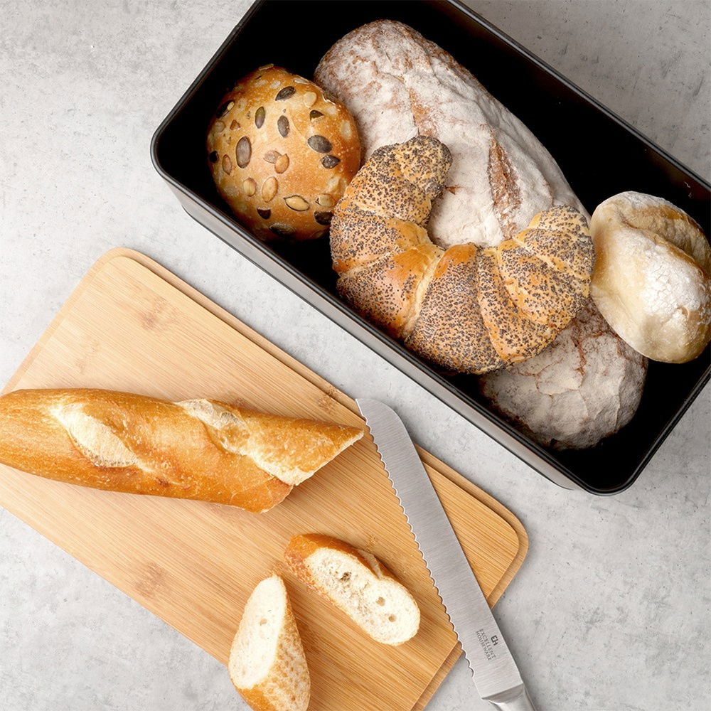 Pojemny chlebak o nowoczesnym wzornictwie. Posiada praktyczne zamknięcie w formie deski, dzięki czemu możemy wykorzystać ją do krojenia pieczywa. Niezwykle efektownie prezentuje się w kuchni. Prosty, klasyczny wzór sprawi, że pasuje do każdej kuchni. Deskę zalecamy dwukrotnie naoliwić olejem rzepakowym lub oliwą z oliwek, nadmiar zetrzeć i pozostawić na kilka godzin. Następnie umyć dokładnie w gorącej wodzie, wytrzeć i pozostawić do całkowitego wyschnięcia. Dzięki temu zabiegowi deska będzie mniej chłonąć wilgoć i dłużej utrzyma swój prawidłowy kształt. Deski nie wolno myć w zmywarce.