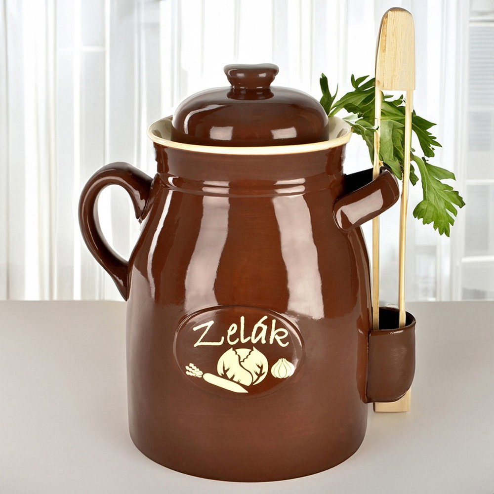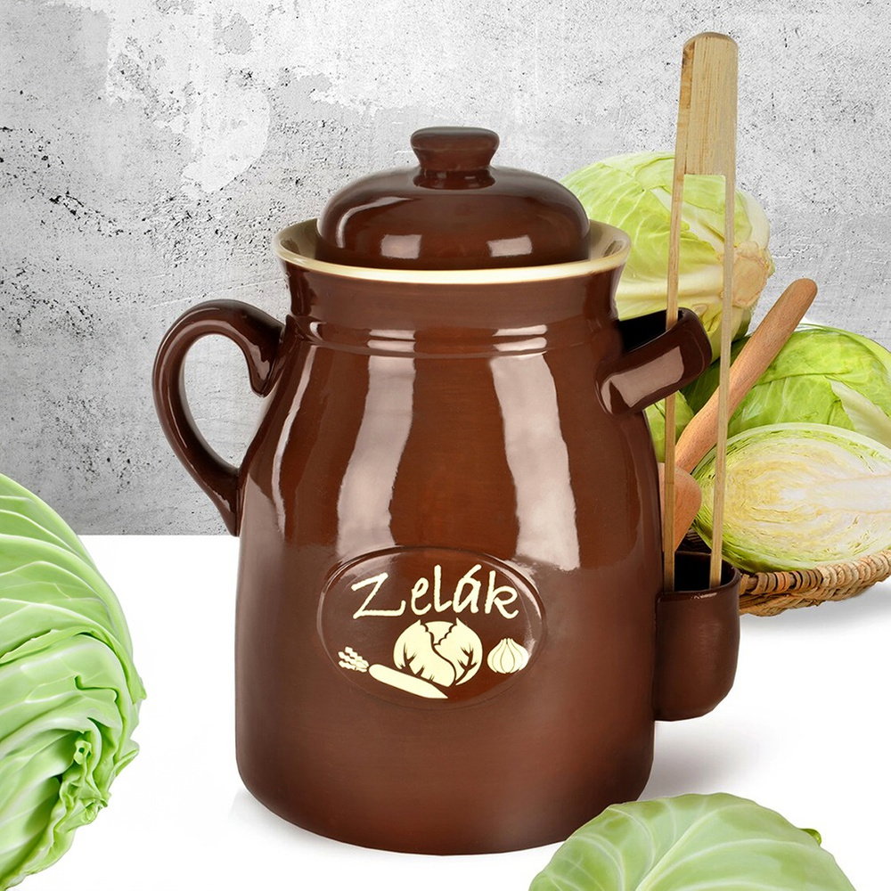 Garnek do kiszenia warzyw z pokrywką i szczypcami. Dzięki szczelnej pokrywce proces fermentacji przebiega w kontrolowany sposób. Garnek jest idealnym naczyniem dla miłośników kiszonek, zapakowany w karton będzie świetnym pomysłem na prezent.