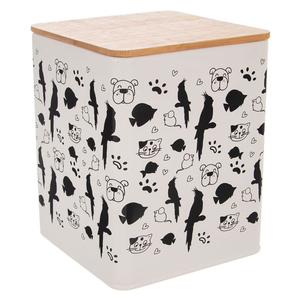 Metalowy pojemnik na karmę dla zwierząt. Zapewnia wygodne i estetyczne przechowywanie karmy, jednocześnie zachowując jej świeżość przez długi czas. Pudełko posiada uroczy dekor, dzięki czemu będzie stanowić niezwykłą ozdobą kuchni lub innego pomieszczenia. Pojemnik jest uniwersalny, idealny do przechowywania karmy dla psów, kotów, ptaków, czy nawet gryzoni.
