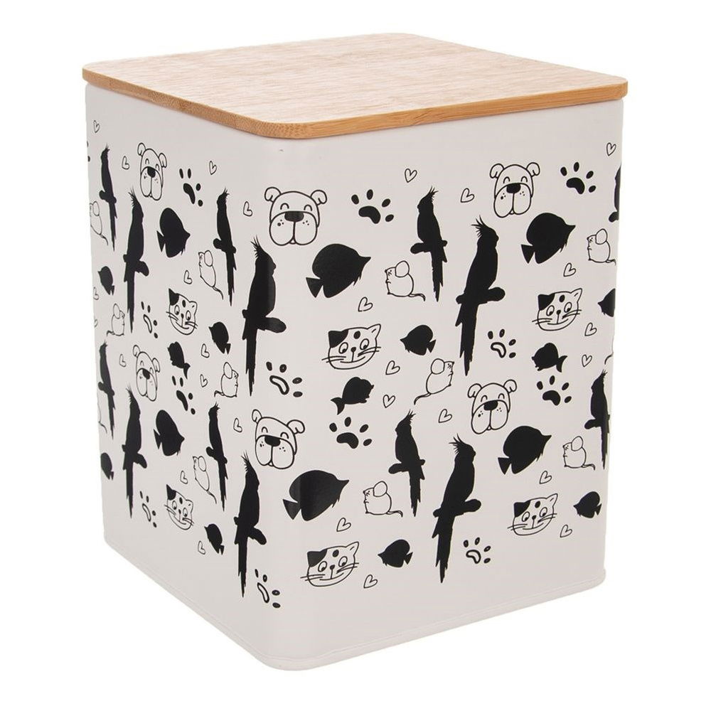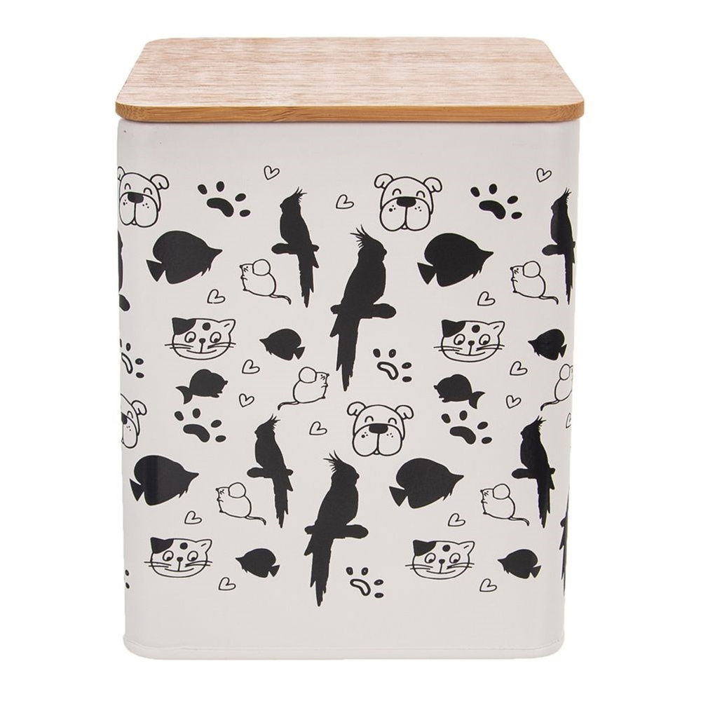 Metalowy pojemnik na karmę dla zwierząt. Zapewnia wygodne i estetyczne przechowywanie karmy, jednocześnie zachowując jej świeżość przez długi czas. Pudełko posiada uroczy dekor, dzięki czemu będzie stanowić niezwykłą ozdobą kuchni lub innego pomieszczenia. Pojemnik jest uniwersalny, idealny do przechowywania karmy dla psów, kotów, ptaków, czy nawet gryzoni.