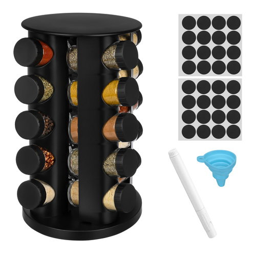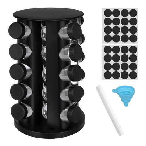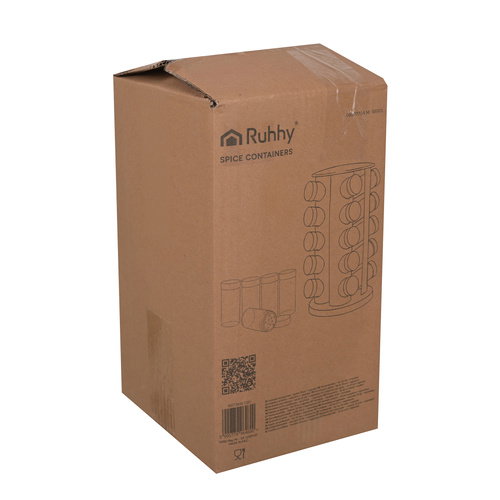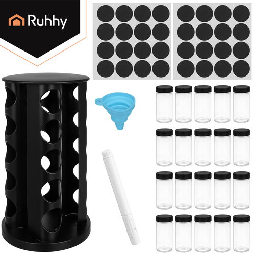 - Co zawiera zestaw - Obrotowy stojak Ruhhy - 20 × pojemnik na przyprawy - Naklejki (ok. 120 szt.) - Marker do opisu - Lejek silikonowy - Opakowanie
