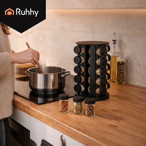 Zestaw pojemników na przyprawy Ruhhy to praktyczne i eleganckie rozwiązanie, które pozwala uporządkować kuchnię i mieć wszystkie przyprawy zawsze pod ręką. Dzięki obrotowemu stojakowi oraz kompletnemu wyposażeniu gotowanie staje się wygodniejsze, szybsze i bardziej intuicyjne. To produkt polskiej marki i polskiego producenta, co gwarantuje jakość wykonania, trwałość oraz bezpieczeństwo użytkowania.