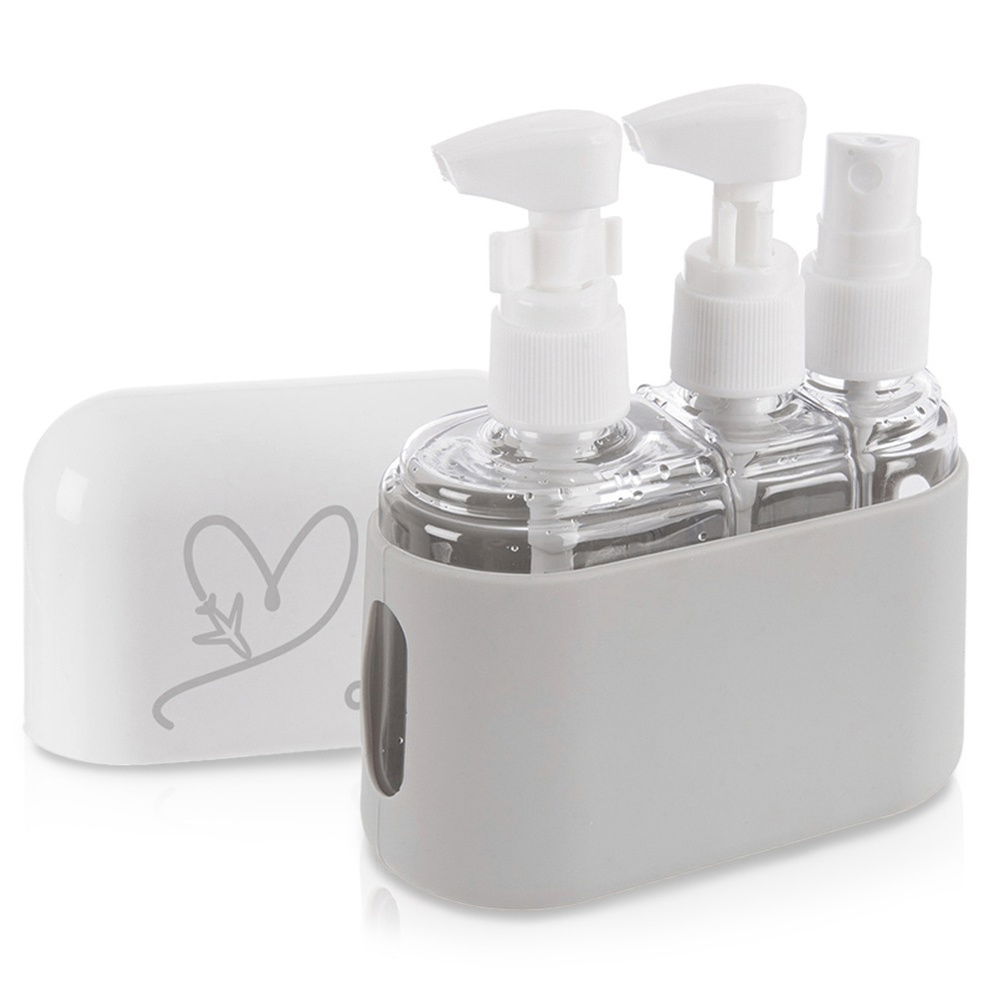 Zestaw podróżnych buteleczek na kosmetyki w etui - Praktyczny komplet trzech buteleczek w poręcznym, zamykanym etui. Solidne, zamykane etui zabezpiecza buteleczki przed uszkodzeniem i zabrudzeniem, a jednocześnie ułatwia ich przechowywanie w torbie lub walizce. W zestawie: 1x butelka z atomizerem o pojemności 50 ml i wymiarach 4,5 x 3 x 10,5 cm, 1x butelka z dozownikiem o pojemności 50 ml i wymiarach 4,5 x 2,5 x 11,5 cm oraz 1x butelka z dozownikiem o pojemności 100 ml i wymiarach 5 x 4,5 x 11,5 cm. Pojemniki umieszczone w etui mają wymiar 10,5 x 5 x 11,5 cm.