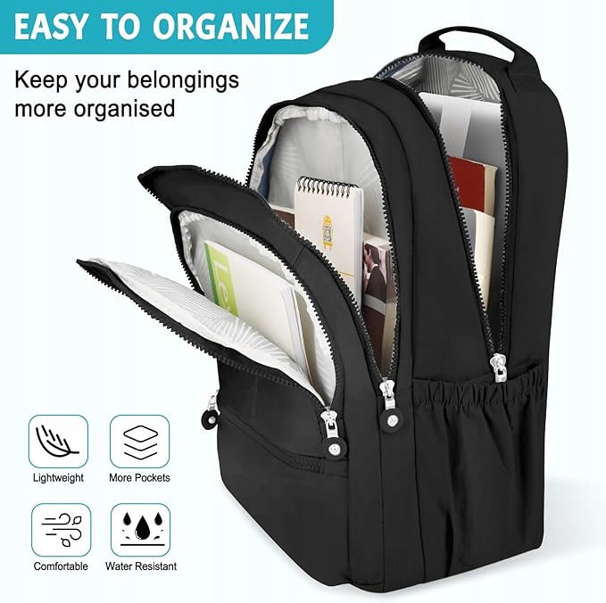 Duża pojemność i inteligentna organizacja: Główna komora plecaka wyposażona jest w kieszeń na laptopa, która pomieści urządzenie o przekątnej do 15,6 cala. Dodatkowe dwie przednie kieszenie oraz elastyczne kieszenie boczne zapewniają wystarczająco dużo miejsca na butelki z wodą, parasole, książki, segregatory, okulary, piórnik, portfel i wiele innych codziennych akcesoriów.