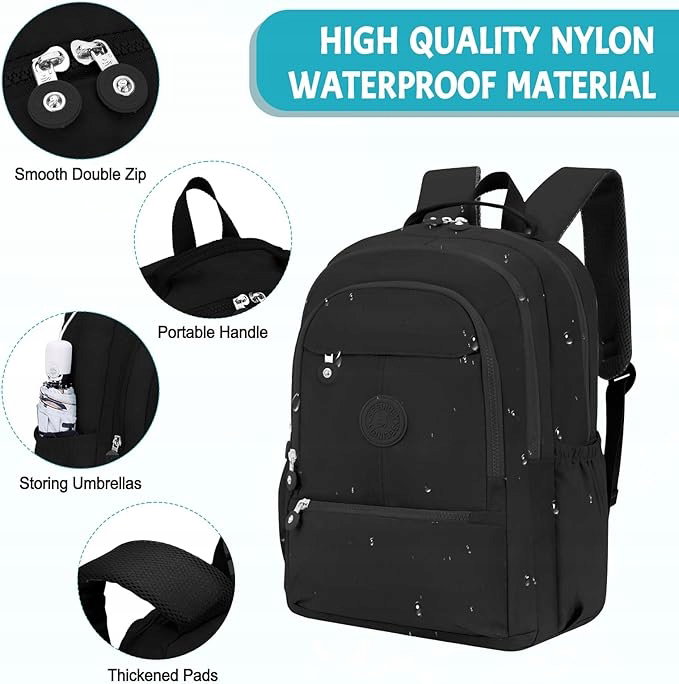 Wodoodporny materiał: Wykonany z wysokiej jakości, trwałej tkaniny nylonowej, plecak zapewnia ochronę przed deszczem i wilgocią. Podwójny zamek błyskawiczny w głównej komorze ułatwia szybki dostęp do zawartości.