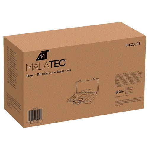 - SPECYFIKACJA - producent: Iso Trade; marka: MALATEC; materiał: (glina) + 5 kostek (PP) + 2 talie kart (PP) + 1 kluczyk (żelazo) + 1 dealer (PP) + 1 big blind (PP) + 1 small blind (PP) w walizce (materiał zewnętrzny: aluminium, pozostałe: żelazo + PP, materiał wewnętrzny: pianka PE, pozostałe: PP + flanela + MDF); wymiary walizki: 39 x 27 x 7 cm; waga 1 żetonu: 10g; waga zestawu: 4,38 kg; waga zestawu opakowaniem: 4,64 kg.