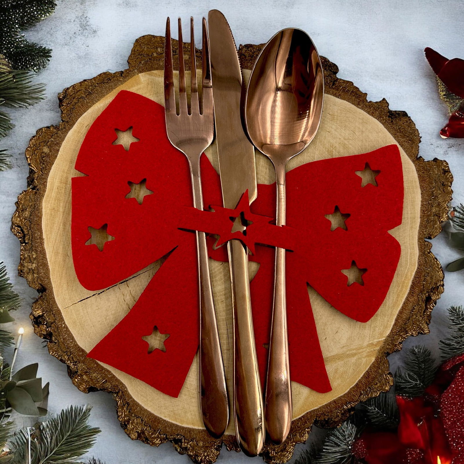 Zestaw 4 podkładek pod sztućce z filcu RPET w kształcie kokardki . Dekoracje są tak samo ważne jak samo jedzenie w tworzeniu magicznej atmosfery na świąteczny obiad lub kolację. Udekoruj swój stół i talerze tymi filcowymi uchwytami na sztućce.