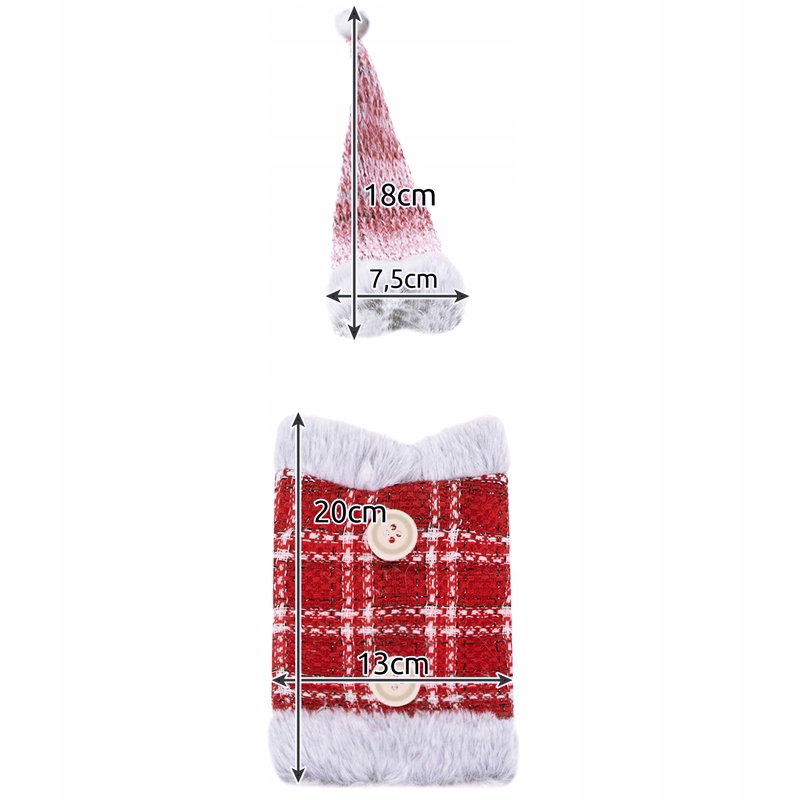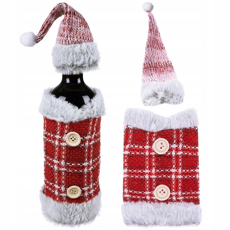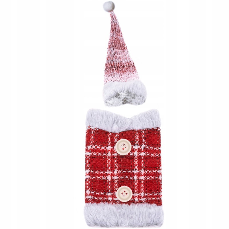 - KLASYCZNY MOTYW ŚWIĄTECZNY - etui na butelkę + czapeczka posiada klasyczny motyw świąteczny. W zestawie jest ubranko z czapką i pomponem. Dodatkowym zdobieniem są guziki oraz futerko.