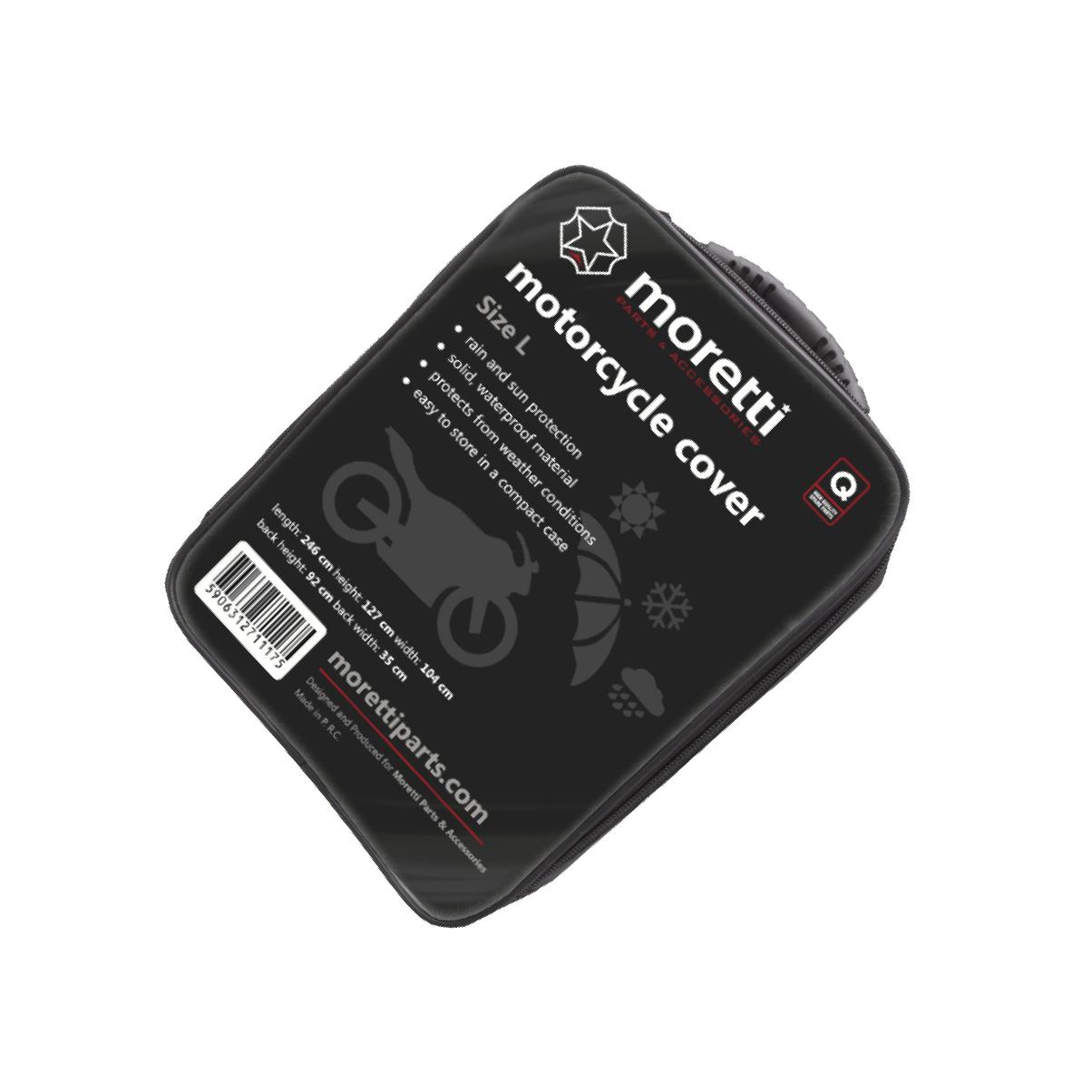 - Wysokiej jakości pokrowiec firmy MORETTI wykonany z bardzo trwałego i odpornego na wszelkie czynniki atmosferyczne materiału. W komplecie etui na pokrowiec. Wykonany w taki sposób, że bez problemu możemy zasłonić cały motocykl