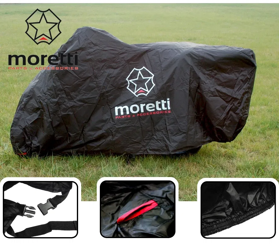 - Wysokiej jakości pokrowiec firmy MORETTI wykonany z bardzo trwałego i odpornego na wszelkie czynniki atmosferyczne materiału. W komplecie etui na pokrowiec. Wykonany w taki sposób, że bez problemu możemy zasłonić cały motocykl