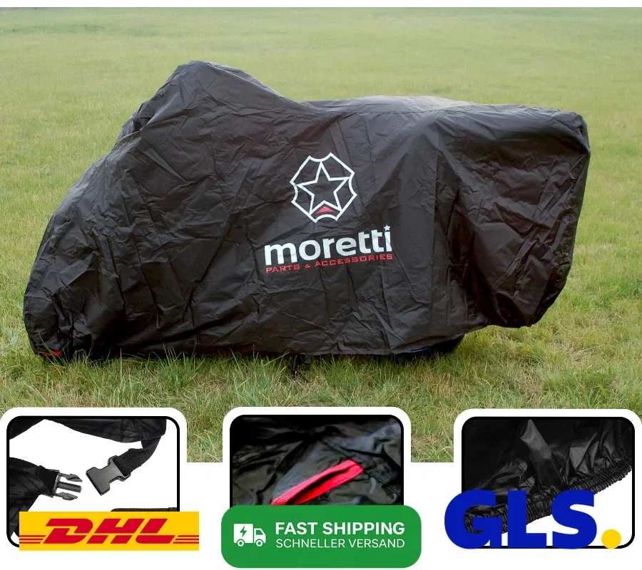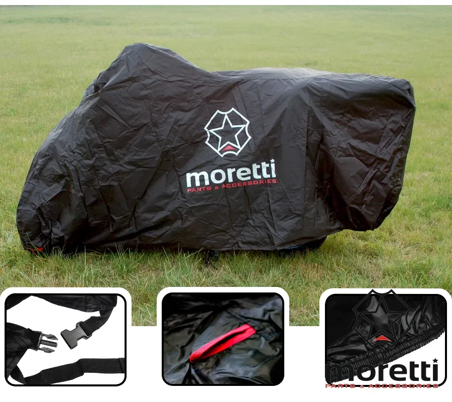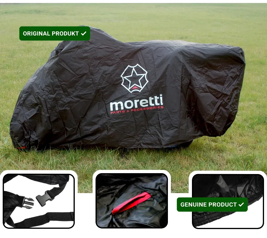 - Wysokiej jakości pokrowiec firmy MORETTI wykonany z bardzo trwałego i odpornego na wszelkie czynniki atmosferyczne materiału. W komplecie etui na pokrowiec. Wykonany w taki sposób, że bez problemu możemy zasłonić cały motocykl