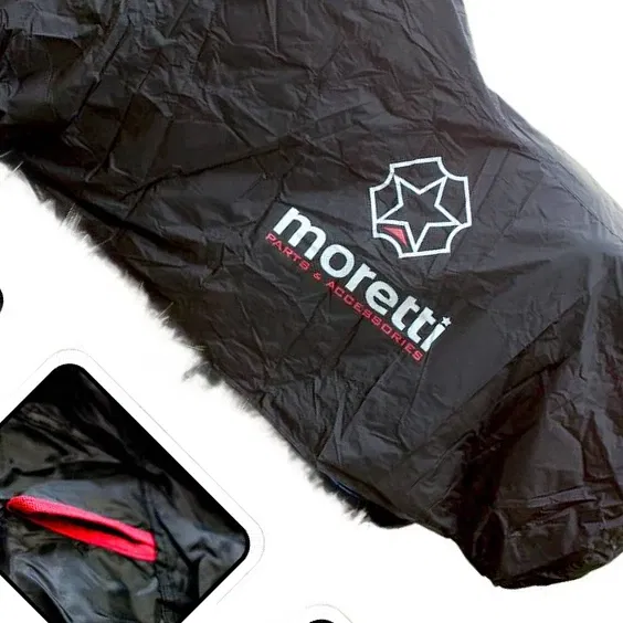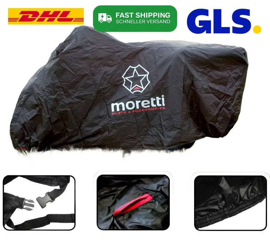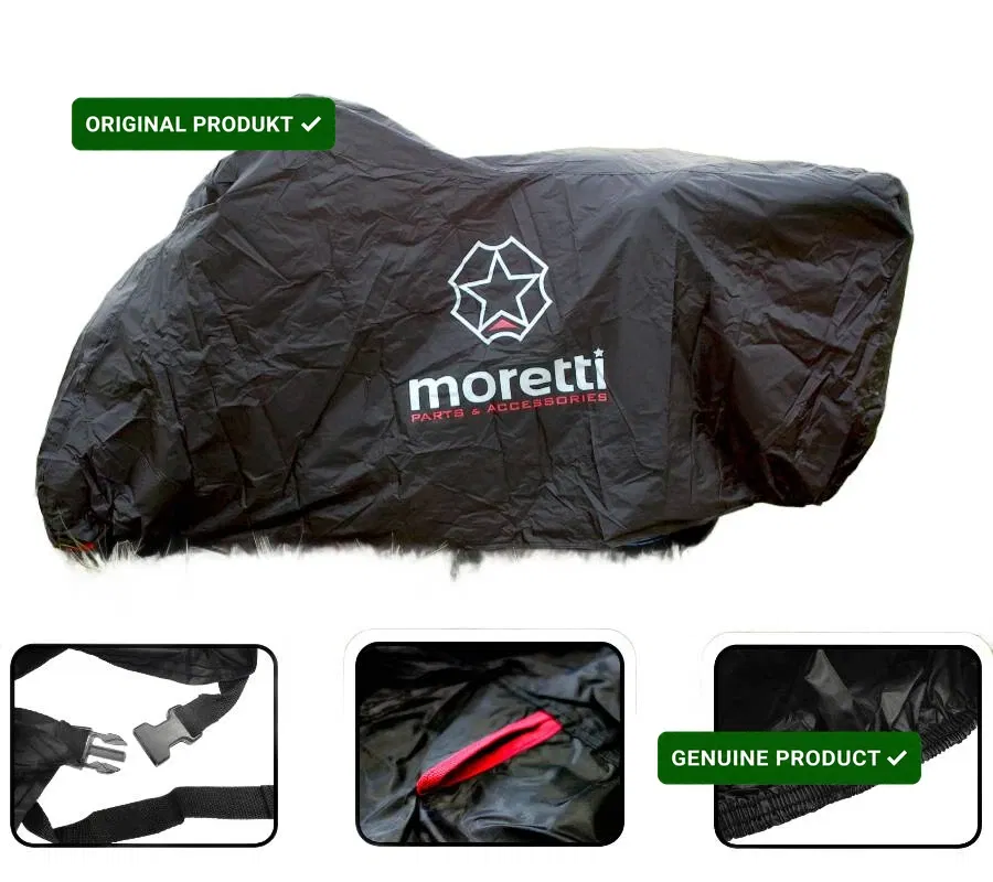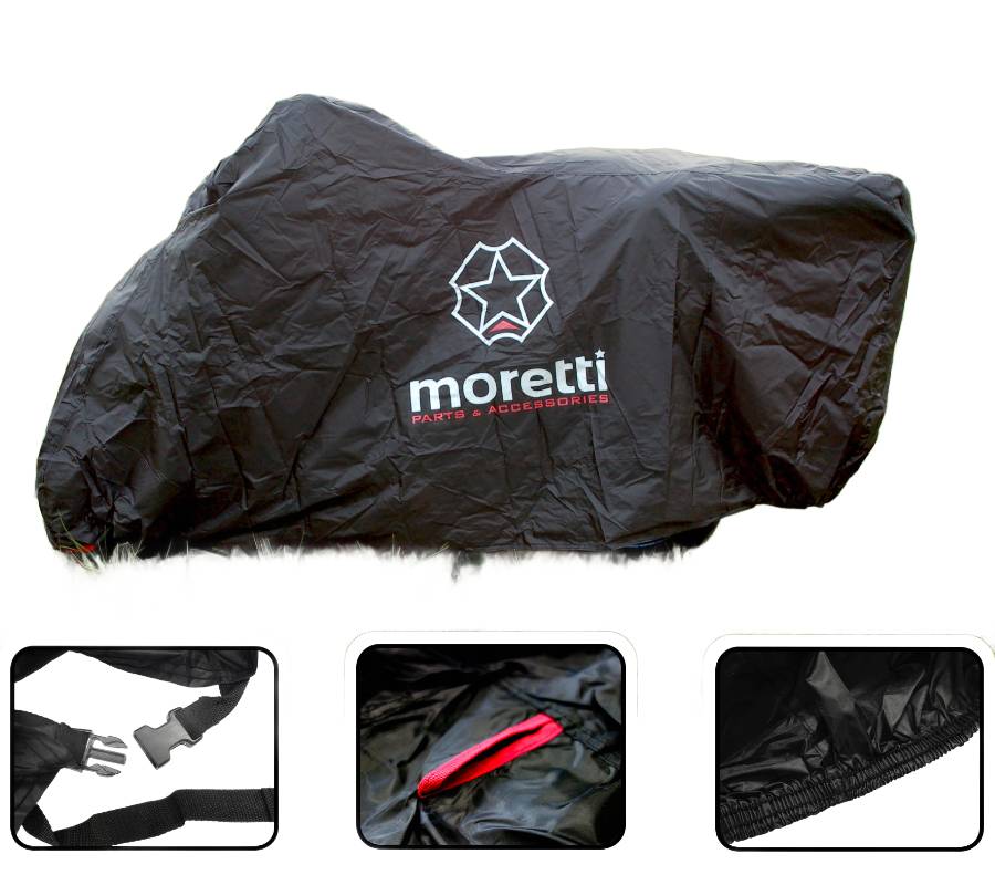 - Wysokiej jakości pokrowiec firmy MORETTI wykonany z bardzo trwałego i odpornego na wszelkie czynniki atmosferyczne materiału. W komplecie etui na pokrowiec. Wykonany w taki sposób, że bez problemu możemy zasłonić cały motocykl