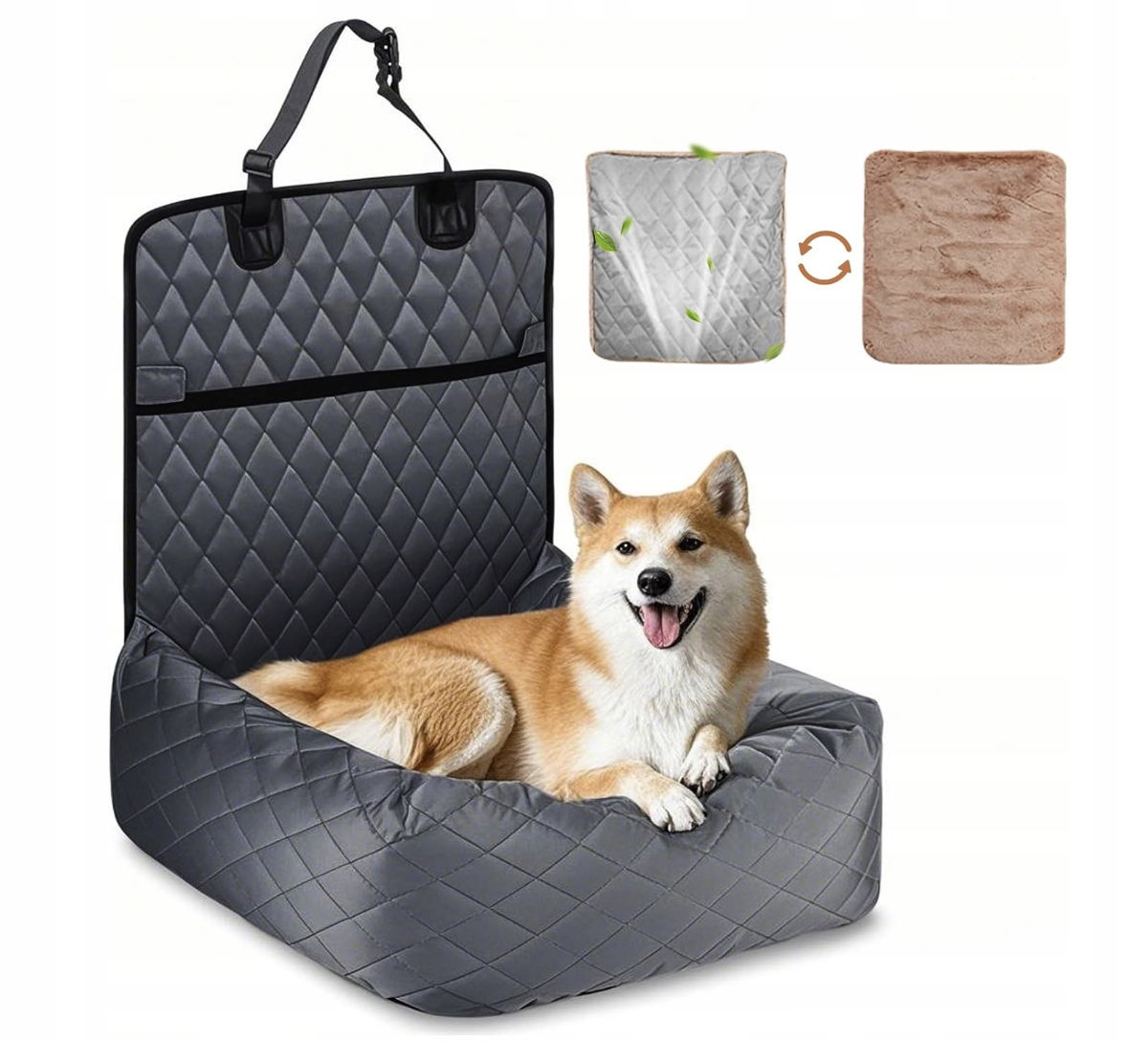 Dwustronne poduszki wykonane z różnych materiałów można stosować zamiennie w zależności od pogody, dzięki czemu możesz z nich korzystać o każdej porze roku, nie martwiąc się, że psu będzie za gorąco lub za zimno w foteliku samochodowym.