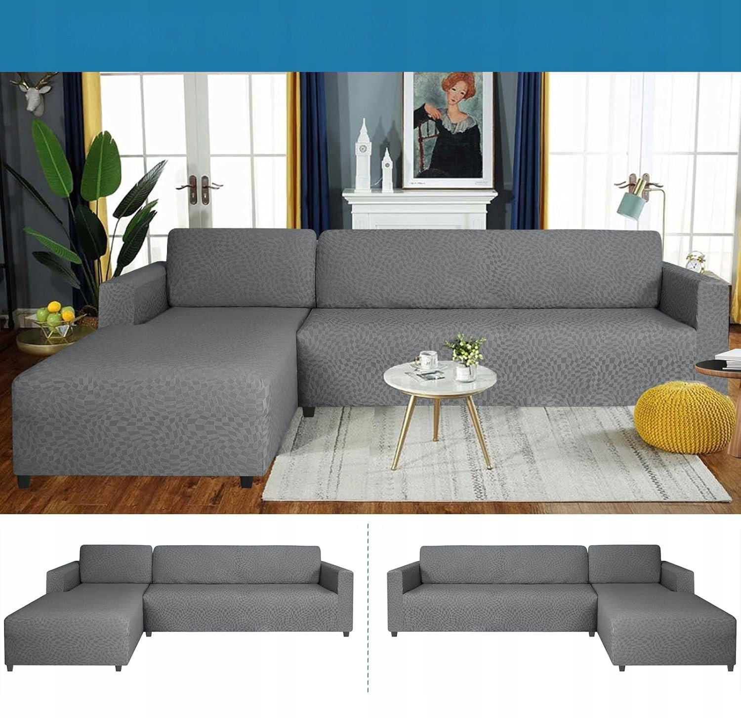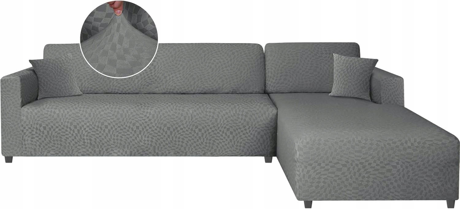 Elastyczny pokrowiec na sofę narożną w kształcie litery L przeznaczony do ochrony i odświeżenia wyglądu mebli wypoczynkowych.
