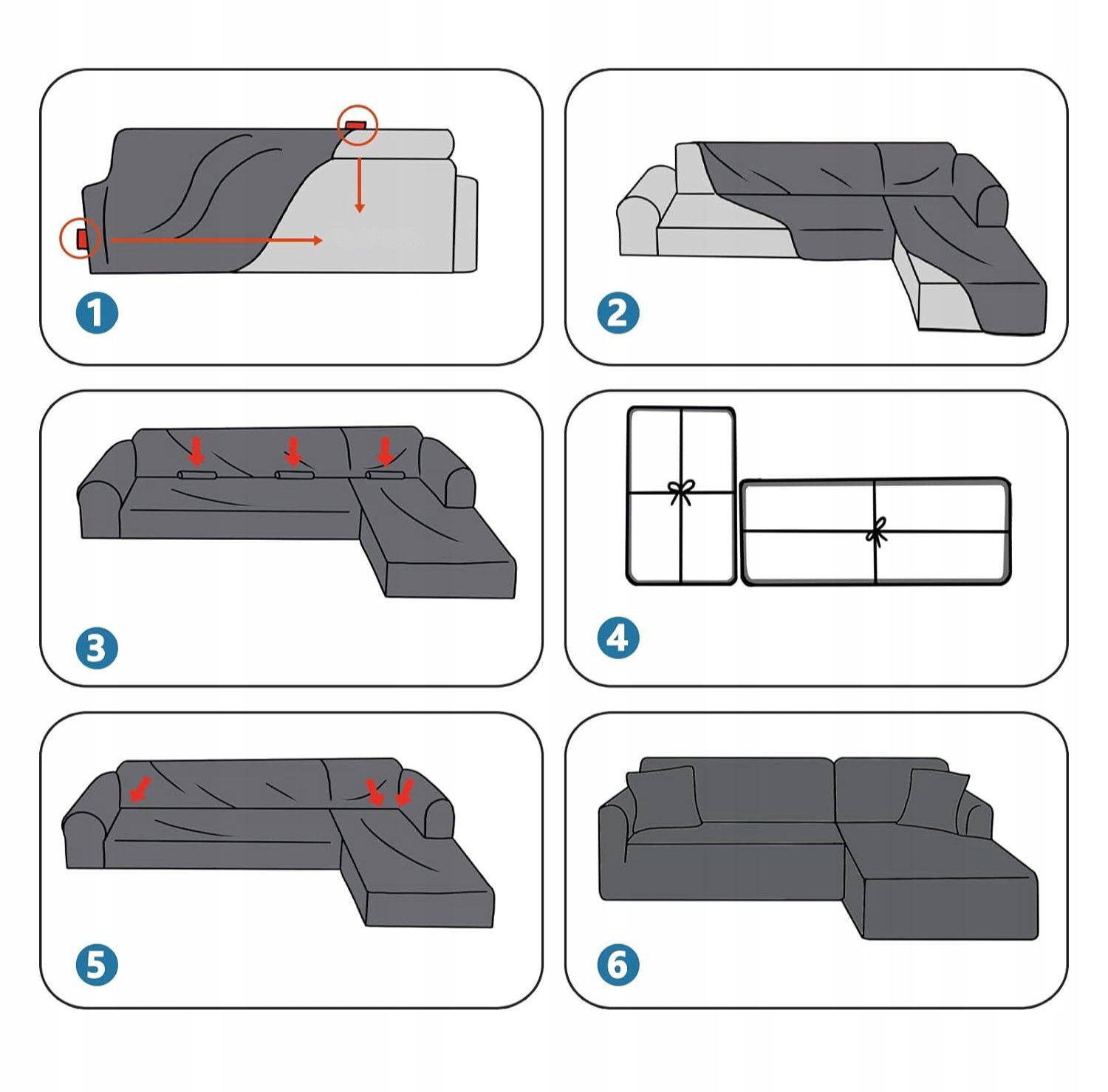 - Pełna ochrona 360°: konstrukcja pokrowca zapewnia osłonięcie całej powierzchni sofy, w tym siedzisk, oparć i podłokietników. Chroni mebel przed przypadkowymi rozlaniami, kurzem oraz zarysowaniami. Pozwala w kilka chwil nadać sofie odświeżony wygląd.