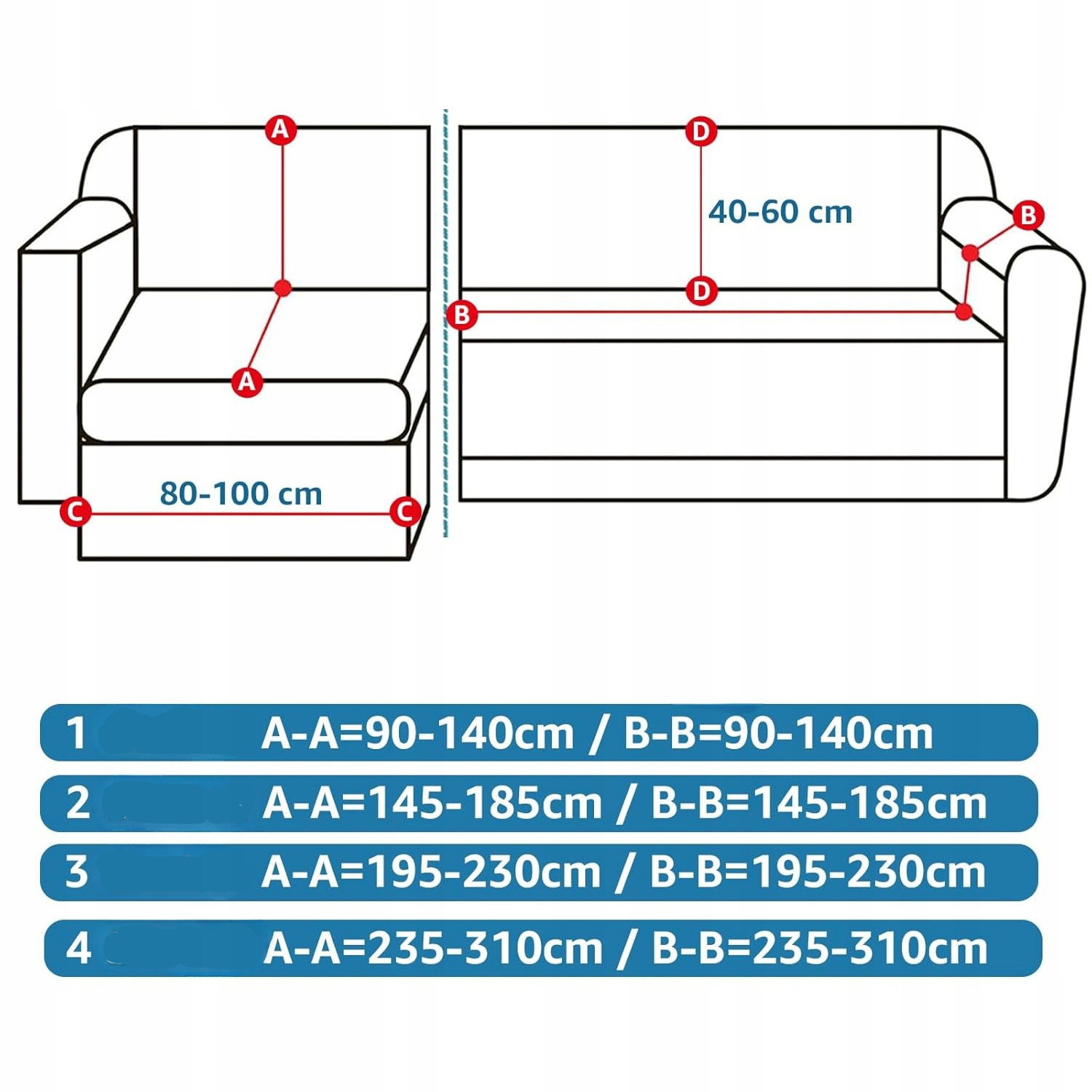 - Dopasowanie i pomiar: dobór rozmiaru opiera się na pomiarach A–A oraz B–B, obejmujących wysokość oparcia, długość półwyspu, wysokość i szerokość podłokietników oraz szerokość głównej części sofy.