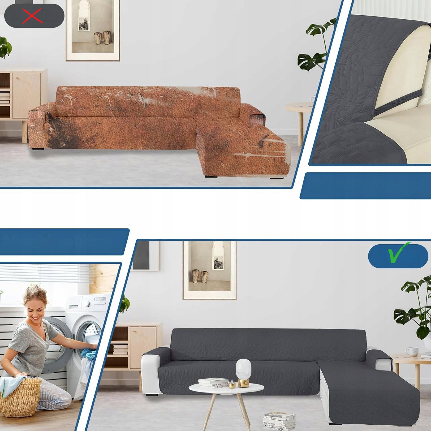- Zastosowanie: pokrowiec przeznaczony jest do sof narożnych typu L z półwyspem w salonach i pokojach dziennych. Chroni siedziska, oparcie oraz część podłokietników przed zabrudzeniami i wilgocią. Sprawdza się w codziennym użytkowaniu, także w domach z dziećmi i zwierzętami.