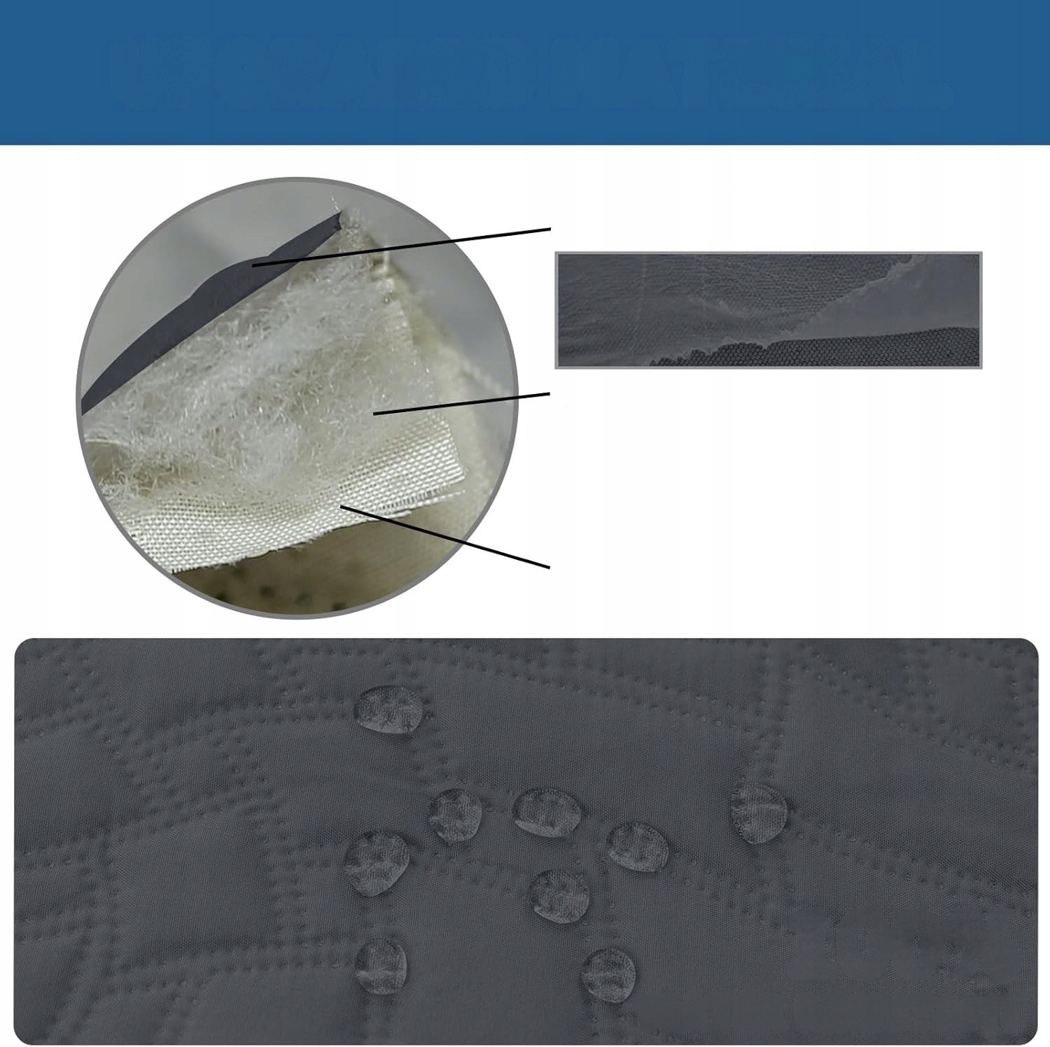 - Materiał: zastosowano wielowarstwową konstrukcję, w której warstwa zewnętrzna z tkaniny typu faux cotton została wyposażona w membranową powłokę ograniczającą przenikanie cieczy, dzięki czemu rozlane płyny nie wsiąkają w głąb powierzchni. Warstwa środkowa z wypełnienia z włókna bawełnianego odpowiada za miękkość i komfort użytkowania, jednocześnie stabilizując całą strukturę. Całość uzupełnia spodnia warstwa z tkaniny faux cotton, która wzmacnia trwałość i zapewnia odporność na wodę, chroniąc powierzchnię przed codziennymi zabrudzeniami i wilgocią.