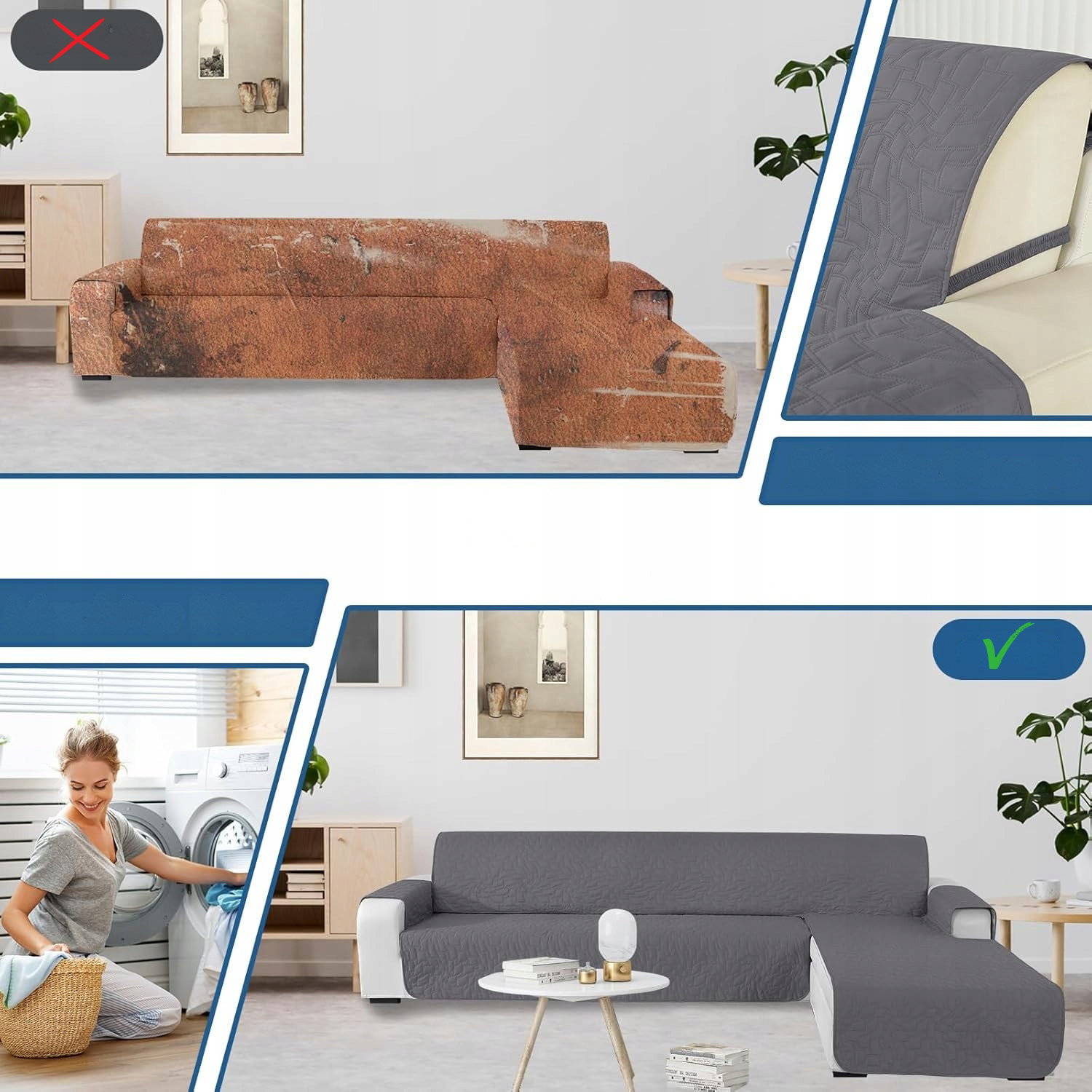 - Kompatybilność lewa / prawa: konstrukcja jest odwracalna i kompatybilna zarówno z lewym, jak i prawym półwyspem. Rozwiązanie pozwala na swobodne dopasowanie pokrowca bez względu na układ narożnika. Jeden wariant pasuje do obu konfiguracji.