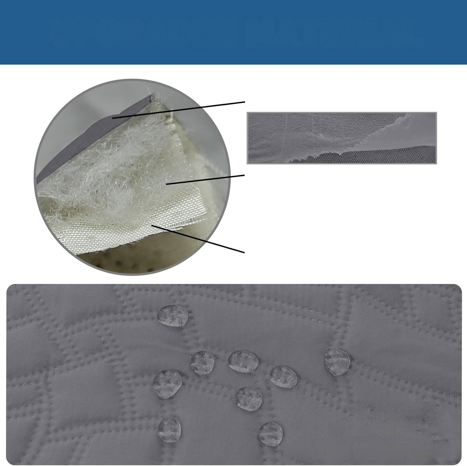 - Materiał: zastosowano wielowarstwową konstrukcję, w której warstwa zewnętrzna z tkaniny typu faux cotton została wyposażona w membranową powłokę ograniczającą przenikanie cieczy, dzięki czemu rozlane płyny nie wsiąkają w głąb powierzchni. Warstwa środkowa z wypełnienia z włókna bawełnianego odpowiada za miękkość i komfort użytkowania, jednocześnie stabilizując całą strukturę. Całość uzupełnia spodnia warstwa z tkaniny faux cotton, która wzmacnia trwałość i zapewnia odporność na wodę, chroniąc powierzchnię przed codziennymi zabrudzeniami i wilgocią.