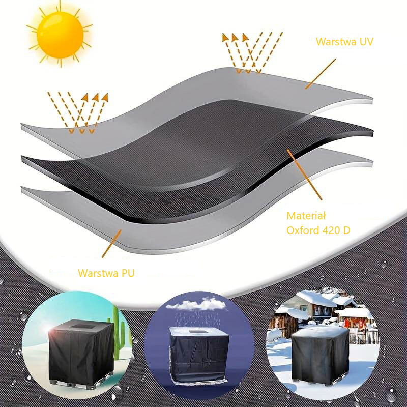 Pokrowiec jest odporny na deszcz, śnieg, kurz oraz promieniowanie UV, co zapewnia długotrwałą ochronę zbiornika w różnych warunkach pogodowych.