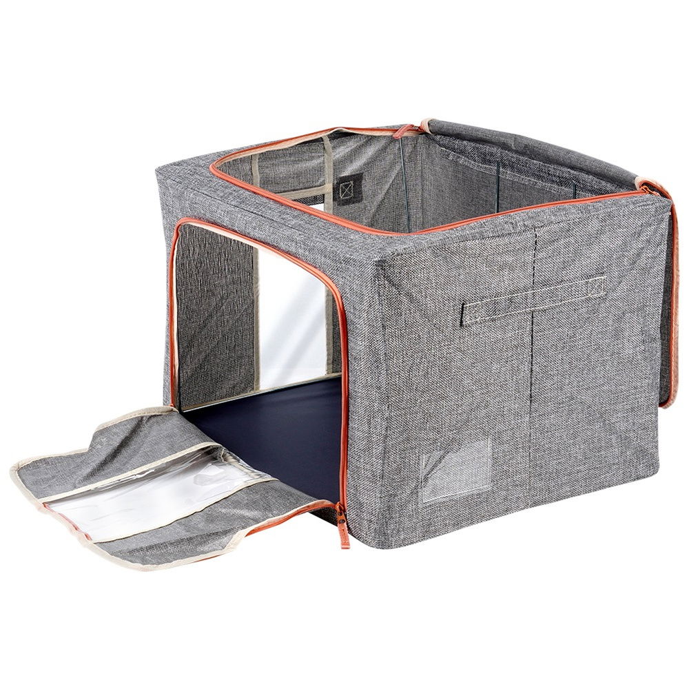 Transparentne okienka i metalowy stelaż - Pokrowiec posiada przezroczyste okienka, umożliwiające szybki podgląd zawartości bez konieczności otwierania, co ułatwia organizację i przechowywanie. Wnętrze pokrowca posiada metalowe stelaże, które nadają mu stabilny kształt, zapobiegając zapadaniu się i ułatwiając przechowywanie ubrań oraz pościeli w estetyczny i uporządkowany sposób. Możliwość złożenia na płasko.