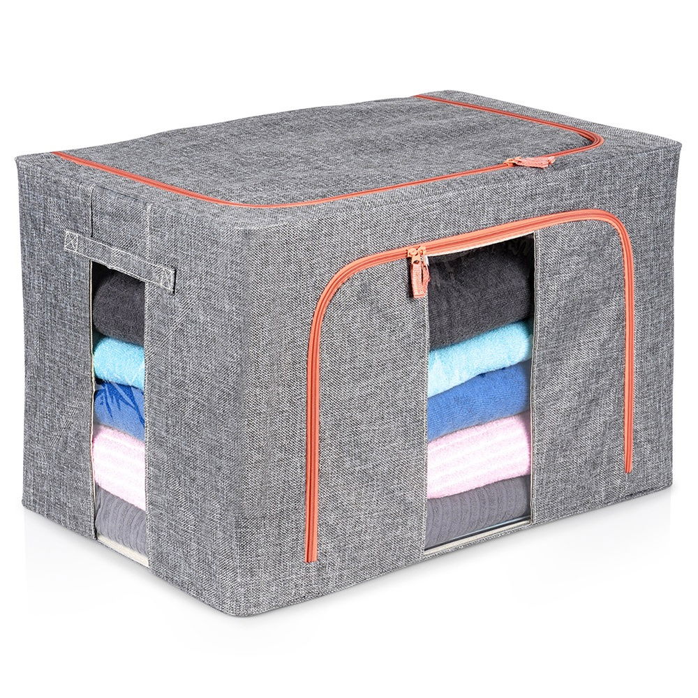 Transparentne okienka i metalowy stelaż - Pokrowiec posiada przezroczyste okienka, umożliwiające szybki podgląd zawartości bez konieczności otwierania, co ułatwia organizację i przechowywanie. Wnętrze pokrowca posiada metalowe stelaże, które nadają mu stabilny kształt, zapobiegając zapadaniu się i ułatwiając przechowywanie ubrań oraz pościeli w estetyczny i uporządkowany sposób. Możliwość złożenia na płasko.