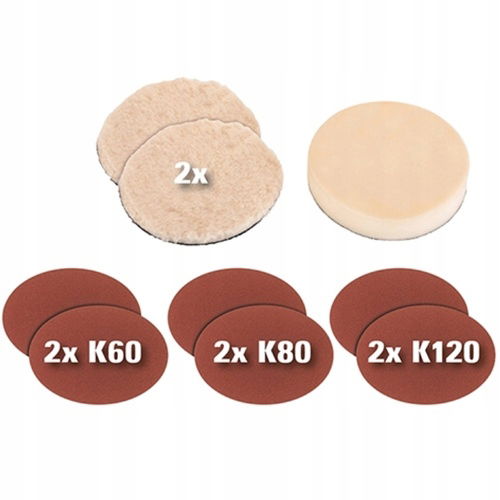 Wyposażenie: Nakładka piankowa, Nakładka syntetyczna 2 szt., Papier ścierny 2 x K120, Papier ścierny 2 x K60, Papier ścierny 2 x K80, Walizka