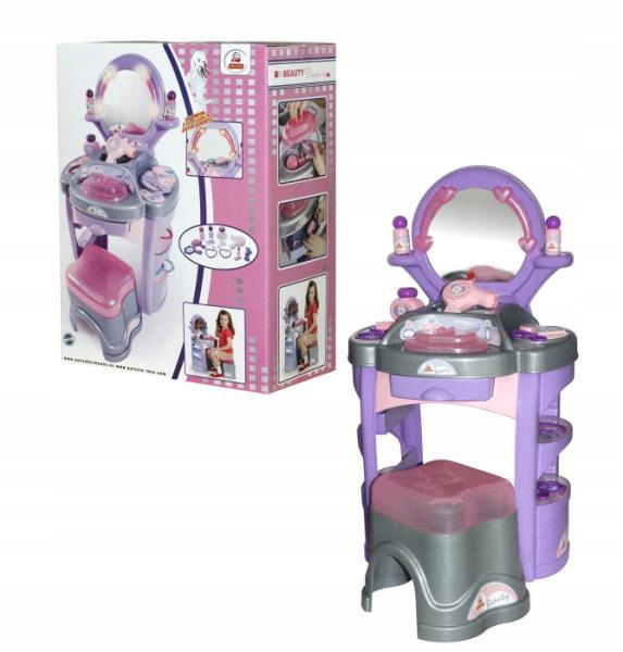 Wykonanie z wysokiej jakości materiałów zagwarantuje bezpieczeństwo i trwałość podczas użytkowania. Zestaw SALON PIĘKNOŚCI DIANA NR 4 to urocza toaletka z kompletem niezbędnych akcesoriów. Wyposażona jest w duże, podświetlane lustro, blat z licznymi przegródkami oraz wysuwaną szufladą, półki na liczne bibeloty oraz plastikową pufę, na której może bezpiecznie przesiadywać nasza mała modnisia. Dodatkowo do zestawu dołączono: trzy pojemniki na kosmetyki, suszarkę, grzebień, małe lustereczko, szminkę, szczotkę, dwie bransoletki, puderniczkę, komplet cieni do oczu oraz kolczyki. Wymiary: 68 x 27,5 x 53 cm Wiek: 3+